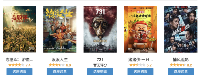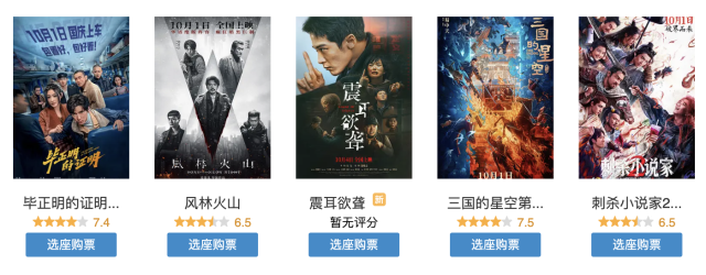 此外,有部分国庆档新片在豆瓣平台上已开分:《三国的星空第一部》7.5分,《志愿军:浴血和平》和《毕正明的证明》均为7.4分,《浪浪人生》6.6分,《风林火山》与《刺杀小说家2》均为6.5分,《猪猪侠·一只老猪的逆袭》5.2分。