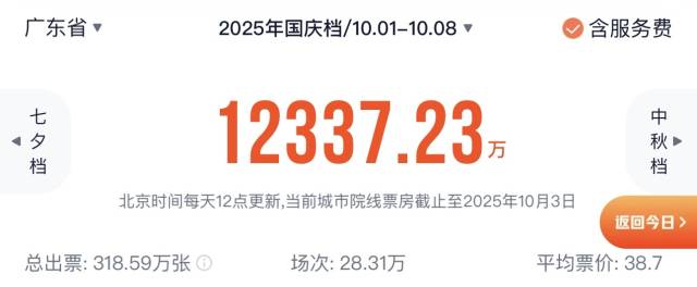 广东省以超1.23亿元的档期票房成绩领跑,约占全国票房的12.3%,总观影人次超318万,总放映场次达28.31万,继续稳居全国“第一票仓”。