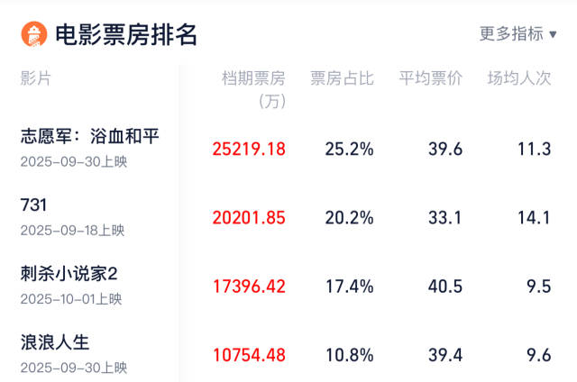 目前档期内有《志愿军:浴血和平》《731》《刺杀小说家2》《浪浪人生》4部影片票房破亿,其中《志愿军:浴血和平》《731》档期票房已超2亿元。