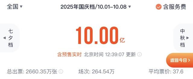 据网络平台数据,截至10月4日12时39分,2025年国庆档(10月1日—8日)总票房(含预售)突破10亿元,总观影人次超2660万,总放映场次超264万。