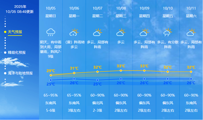 据预测,5日我市有中雨到大雨,局部暴雨,平均风力逐渐加大至5-6级,阵风7-8级,沿海、高地和空旷地区阵风9级;6日(中秋节)降水减弱,阵雨转多云,晚上部分时间可见月光;展望7-10日以多云为主,局部有阵雨。