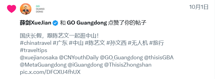作为中山市海外传播品牌官,巴黎奥运会跳水双冠王陈艺文、游泳铜牌得主汪雪儿也不遗余力给中山文旅打call。相关视频在海外社交平台发布后,就收获不少大咖的点赞,当中包括中华人民共和国驻大阪总领事薛剑和GO Guangdong。中山市海外传播中心制作推出的多条国庆期间游玩中山的文旅视频,在海外平台如X、YouTube等,都有不错的阅读量和点赞量,让中山在这个国庆假期期间的文旅对外宣传,传播更广、声量更大,立体展示中山充满活力、富有实力、独具魅力的城市形象,秀出中山的“国际范”。
