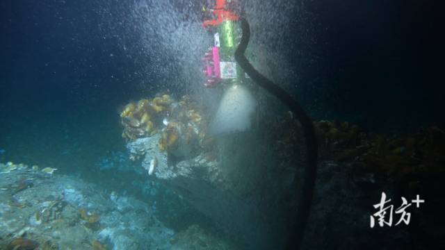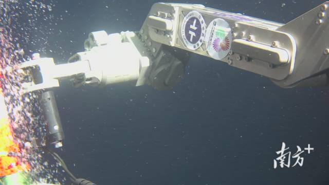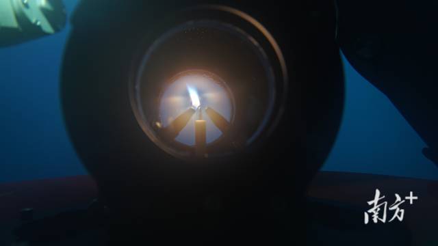 “‘源火’采集要走四步关键流程。”广州海洋地质调查局方法所副所长陈宗恒向南方+记者拆解:先在冷泉口采可燃冰及伴生气,降压分解出甲烷;再用科考船光伏发电转化的电能,远程到海底引燃甲烷;最后由“海马”号无人潜水器带“源火”回甲板,移入源火盒保存。
