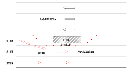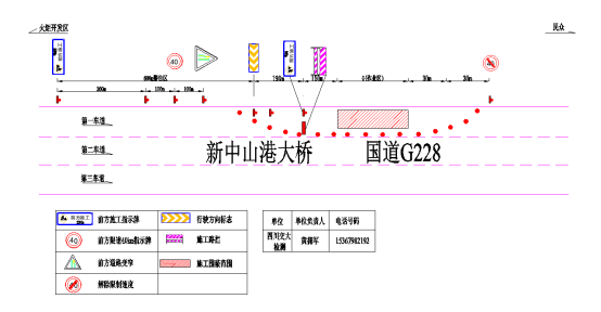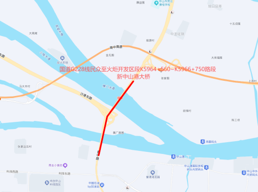 国道G228线K5964+560~K5966+750路段新中山港大桥,占用火炬开发区往民众方向左侧第一车道进行施工作业。