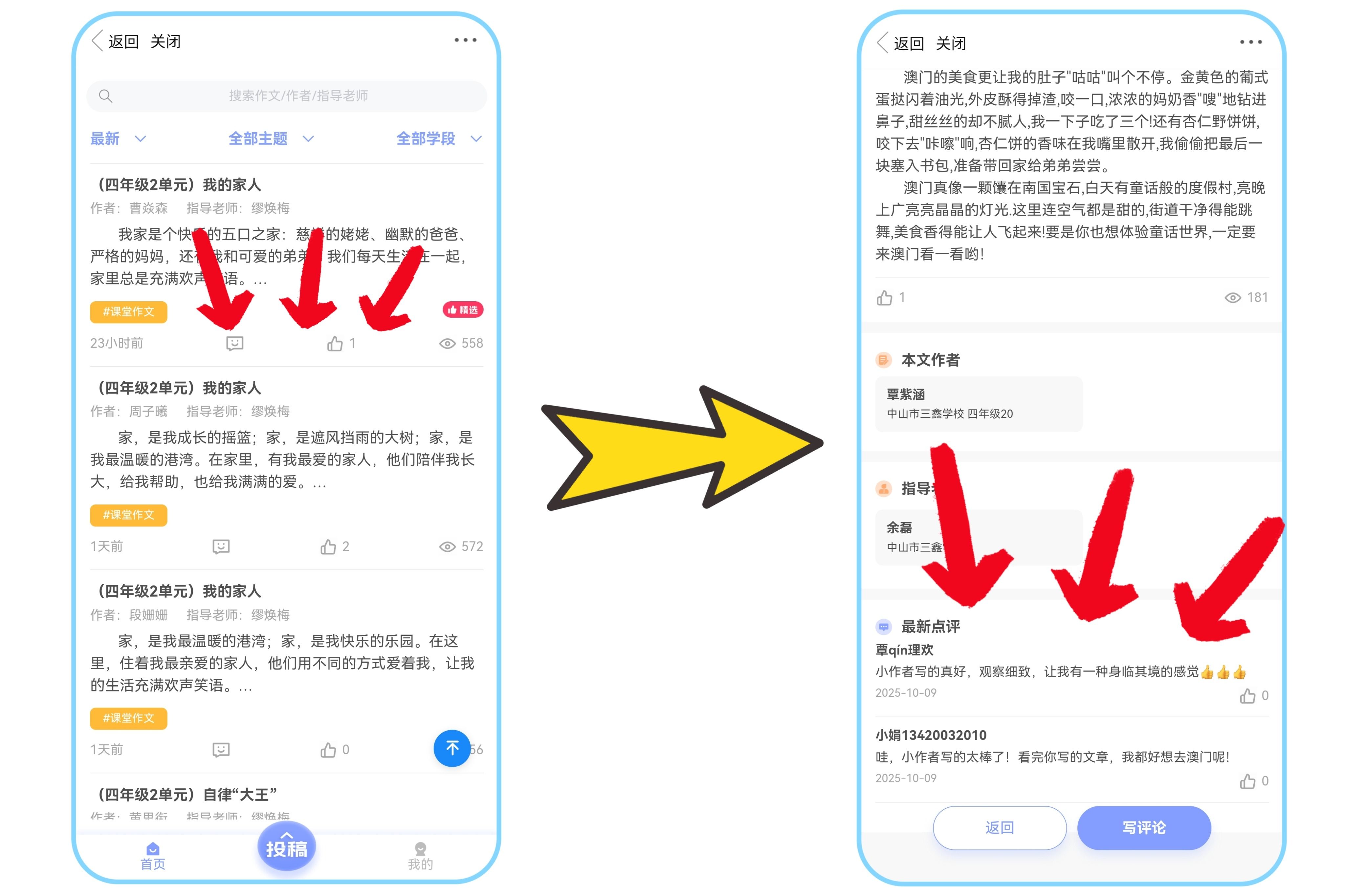 另外,你还能在平台上看到其他同学写的同题作文,学习别人的精彩思路和优美词句。遇到喜欢的作文,还能随手点个赞、写下评论,和其他小作家交流互动,一起进步!