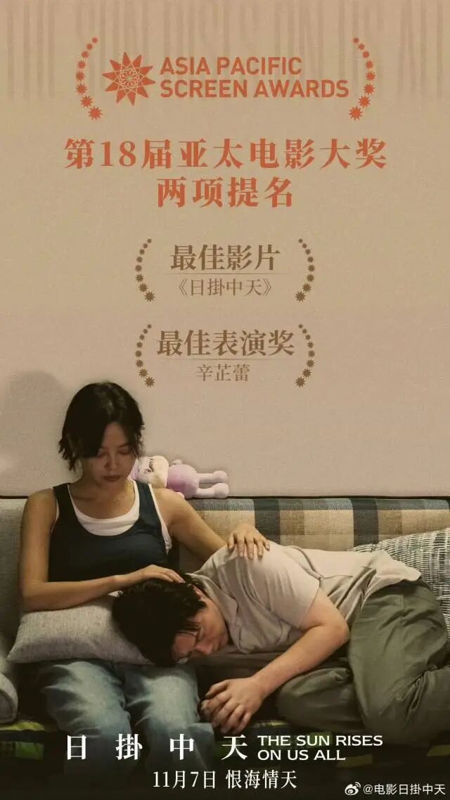 公开资料显示,亚太电影大奖是由亚太电影学院主办的国际性电影奖项,创立于2007年,起源于澳大利亚布里斯班,与联合国教科文组织、国际电影制片人协会合作举办。该奖项涵盖最佳影片、导演、编剧、表演等类别,并设立评审委员会特别大奖及FIAPF杰出成就奖。除《日掛中天》外,本届亚太电影大奖还有刘青云主演的《爸爸》以及舒淇执导的《女孩》等华语电影入围。据悉,颁奖典礼将于11月27日举行。