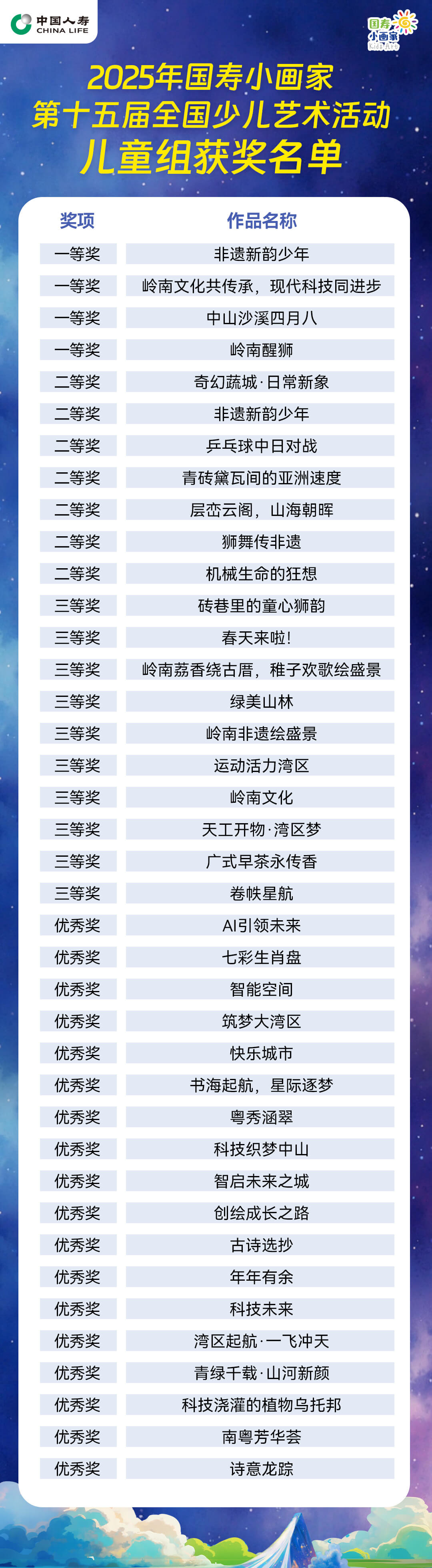 本次大赛鼓励孩子们聚焦湾区科技梦想、城市运动活力、南粤生态之美、少年非遗传承及个人成长足迹等方面进行创作,作品旨在展现新时代湾区风貌,激发创新思维与文化自信。