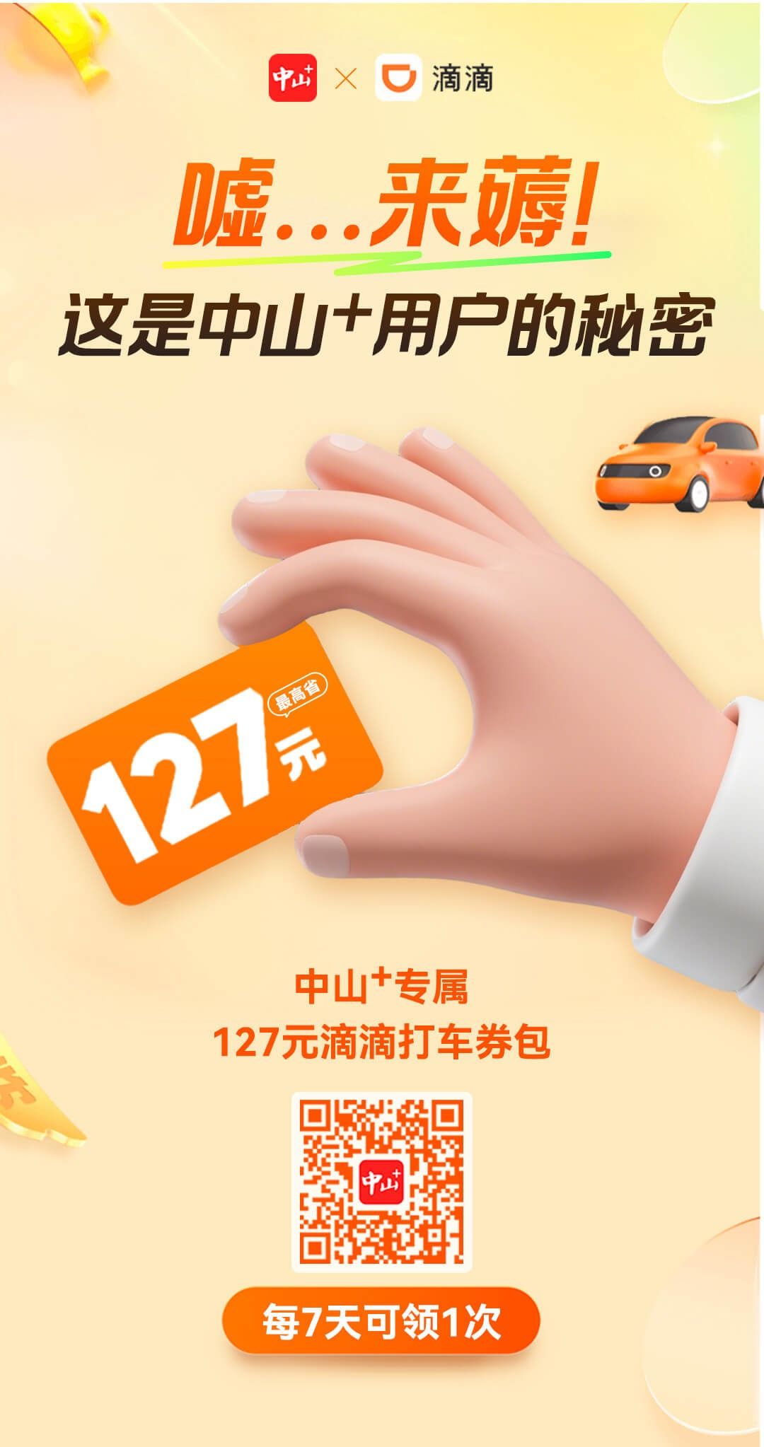 注:具体券的使用细则以领取后【滴滴出行】-【我的】-【优惠券】中的券详情页展示内容为准。互动解释权归“中山+”所有。