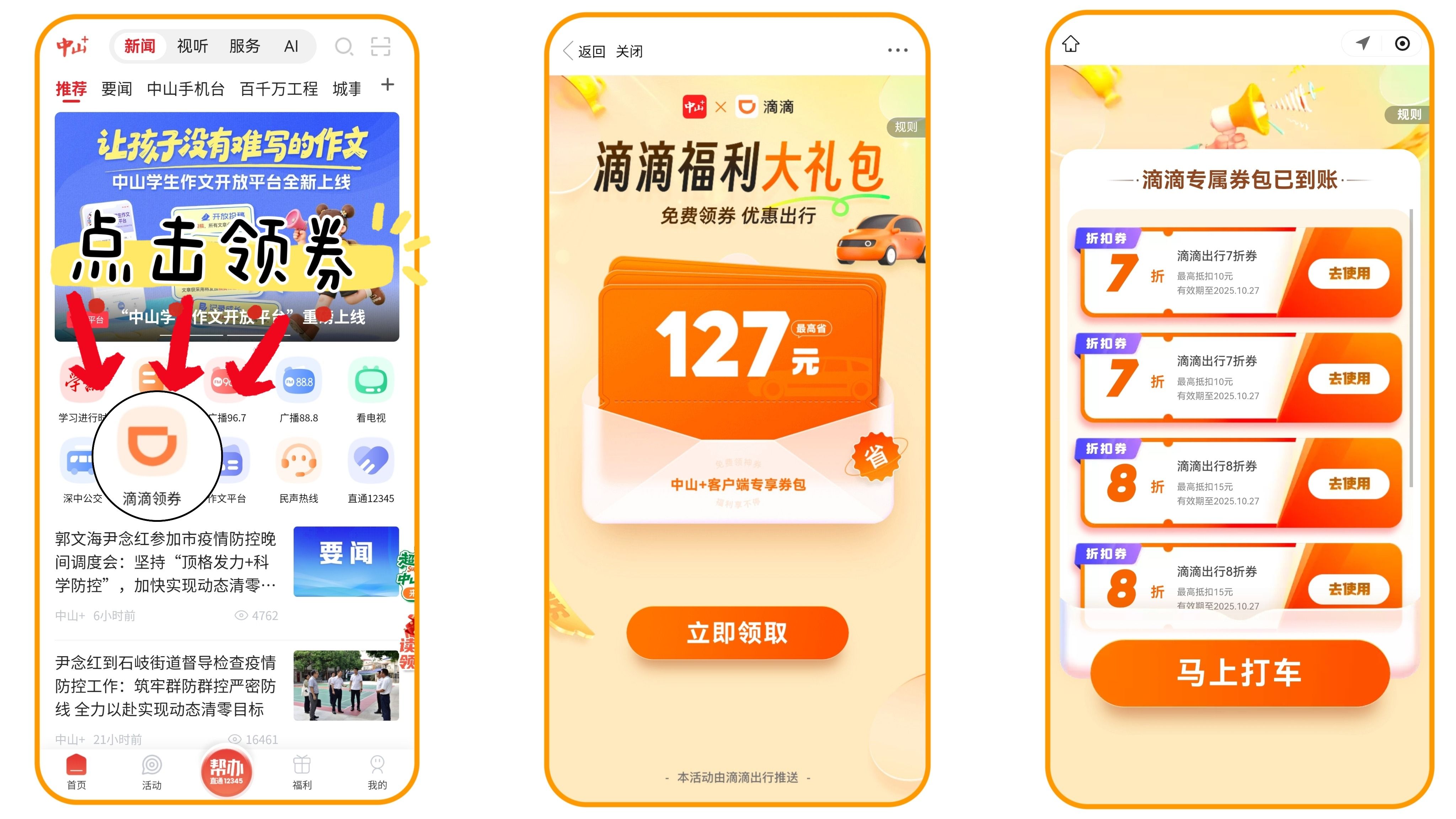 2.进入“中山+”新闻首页,点击“滴滴领券”按钮或弹窗,127元券包将直接到你的滴滴账户。打车支付时,将自动以折后价格结算。