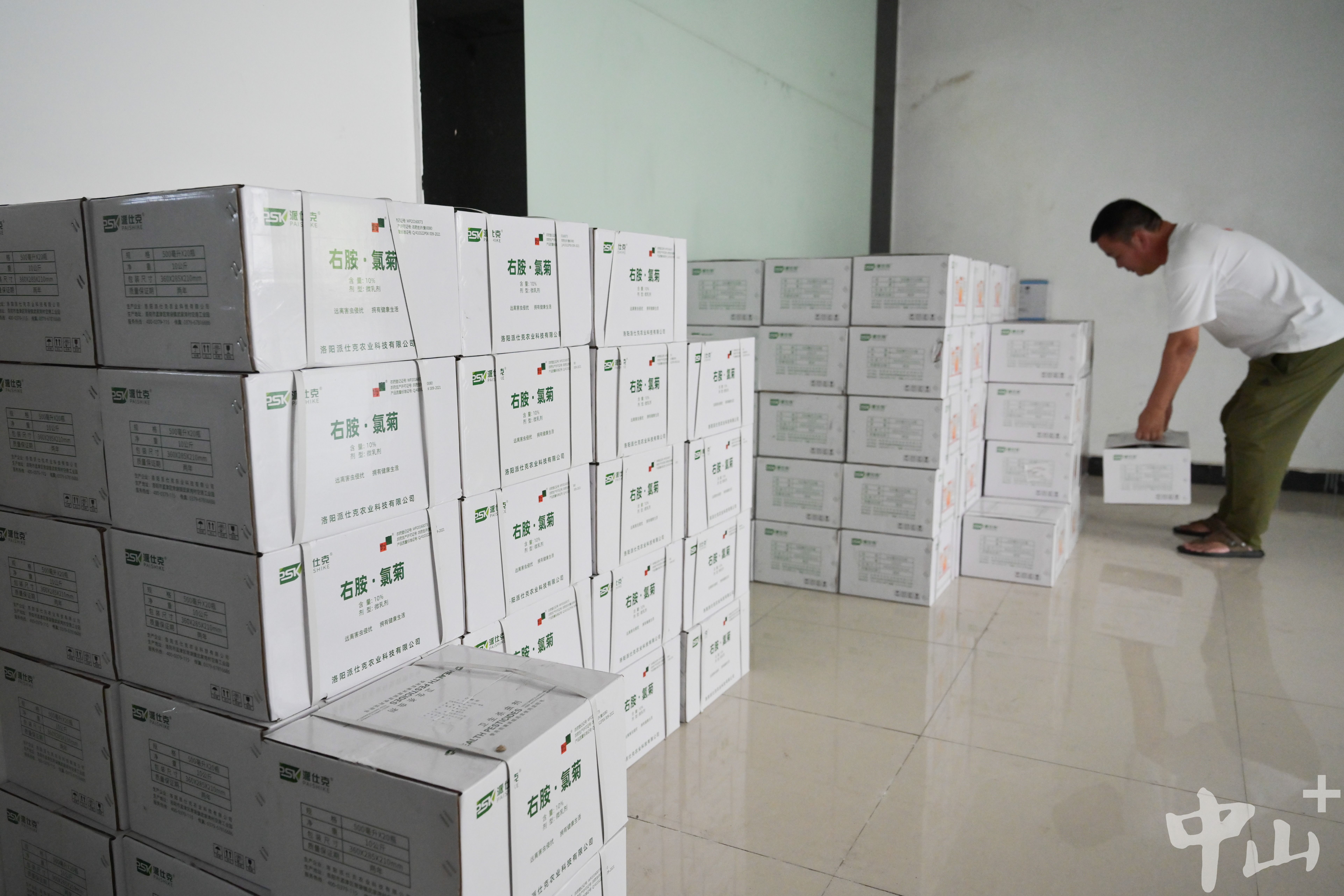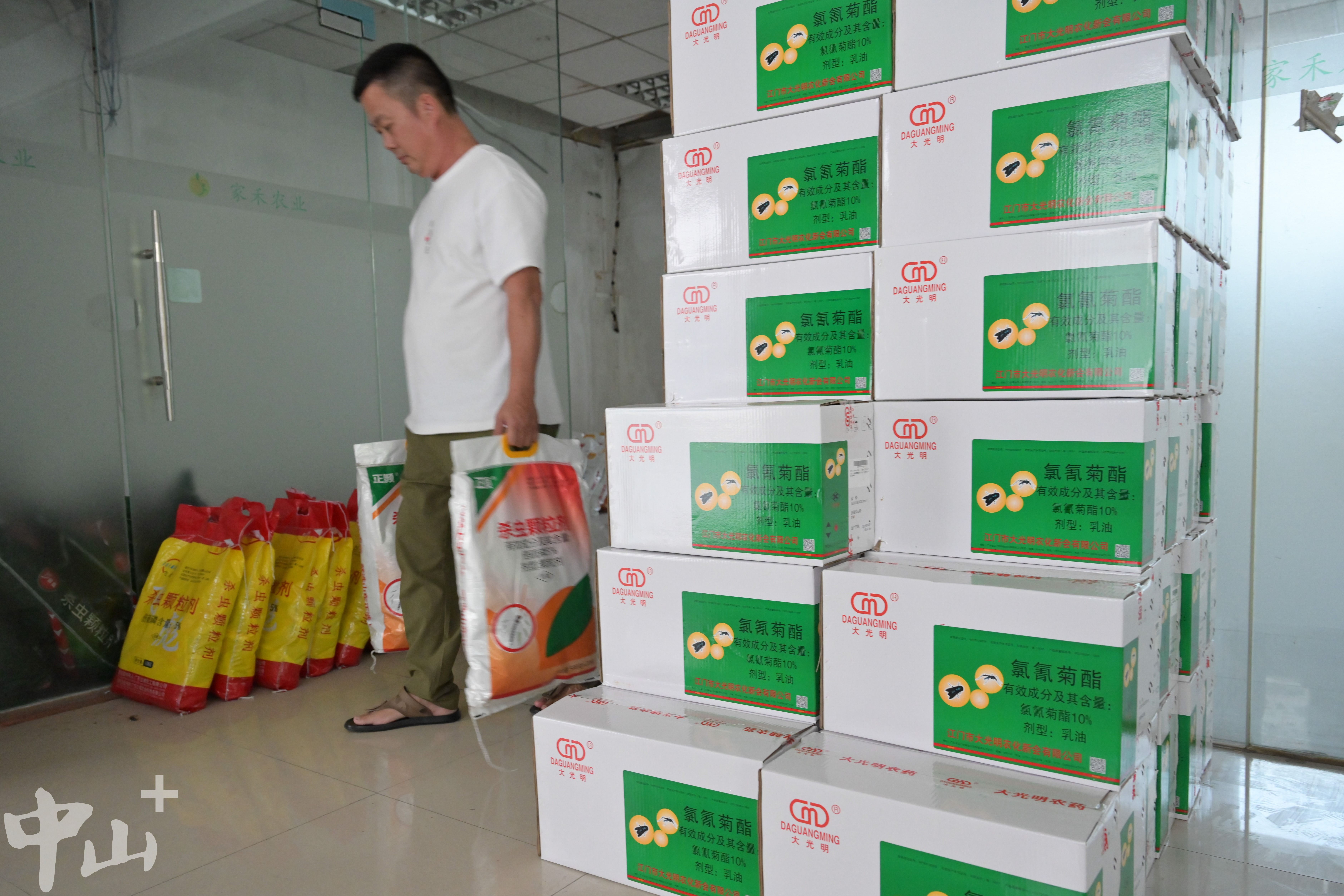 10月16日,记者在中山市消杀站的蚊虫消杀药物和器械临时存放仓库现场看到,一箱箱氯氰菊酯、啶虫脒·氯氟醚菊酯、右胺·氯菊,以及一袋袋杀虫颗粒剂等蚊虫消杀物资,整齐地摆放着。仓库工作人员正在现场清点和搬运相关物资。