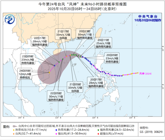 中央气象台10月20日6时继续发布台风蓝色预警:今年第24号台风“风神”(热带风暴级)的中心今天(20日)早晨5点钟位于海南省三沙市(西沙永兴岛)以东大约520公里的南海中部海面上,中心附近最大风力有9级(23米/秒),中心最低气压为990百帕,七级风圈半径220-280公里。