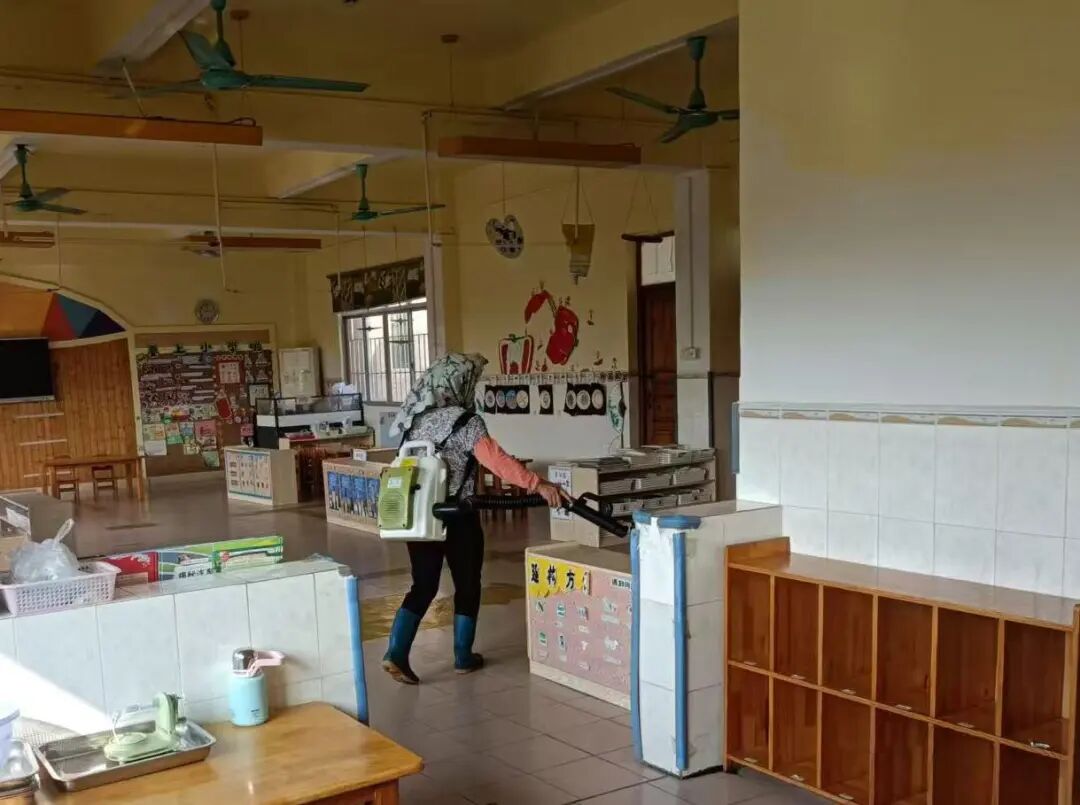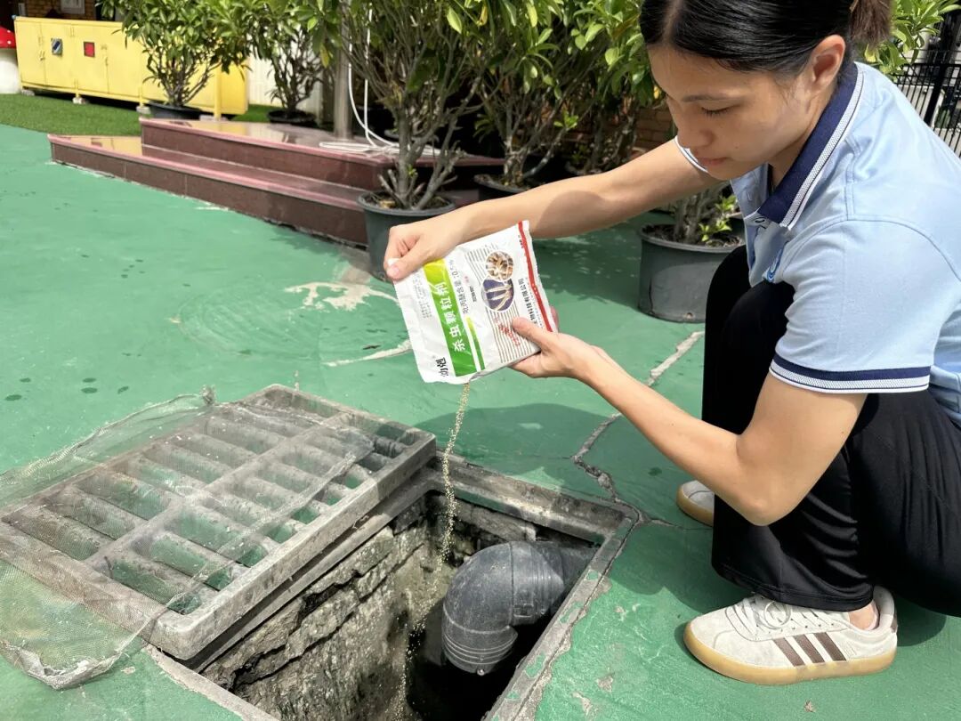 深入开展“无积水校园”行动,每日对教室、办公室、绿化带等区域进行细致排查,重点清理花盆托盘、废弃容器、饮水机水槽等各类积水点。每周对校园集中开展2次全覆盖消杀,在清晨或傍晚蚊虫活跃时段,对绿化带、楼梯间、卫生间、排水沟等关键区域进行药物喷洒,并在门窗、通风口、排水井口加装防蚊网,布设蚊香、电蚊拍、灭蚊灯等防蚊工具,全面阻断蚊虫在校内的孳生与活动路径,确保校园内部环境安全整洁。