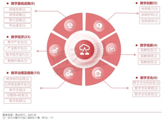 据介绍,该评估体系涵盖数字基础设施、数字经济、数字治理与服务、数字创新、数字低碳、数字文化六大一级指标,共计54项三级指标,对全国200余个城市进行系统评估与分析。