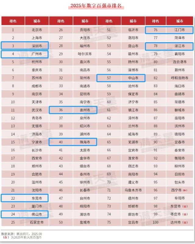 近日,赛迪顾问发布《2025年中国数字城市竞争力研究报告》,同时揭晓了“2025年数字百强市”榜单。其中,广东共有9个地市上榜,分别为深圳、广州、东莞、佛山、惠州、珠海、中山、江门和湛江。其中,中山位列全国第57名。