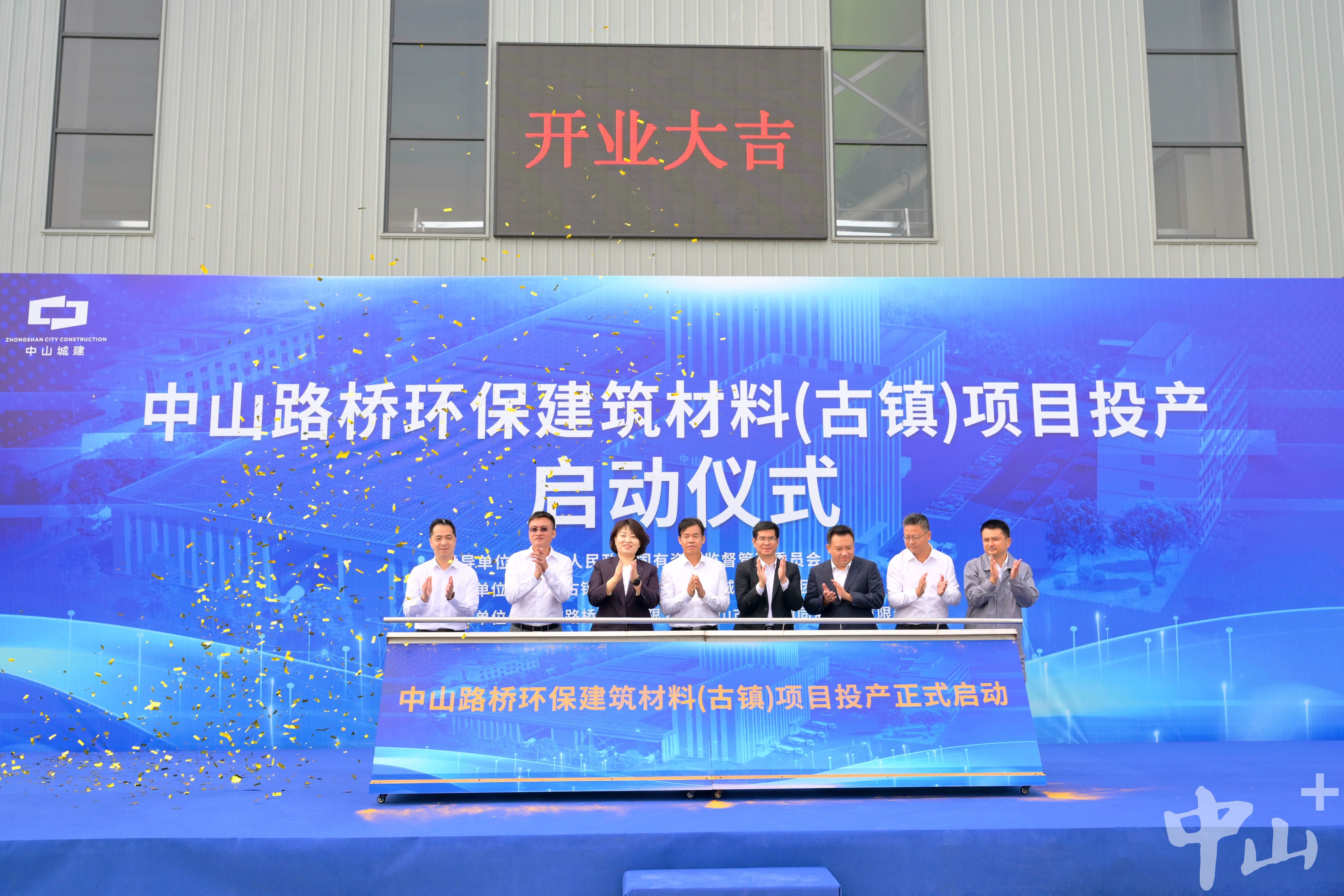 上午10时,项目投产仪式现场,中山市路桥益材科技有限公司分别与中山市灯都新材料科技有限公司、中交路桥建设有限公司签订环保建筑材料合作协议,首批运输车辆满载物料正式出发。
