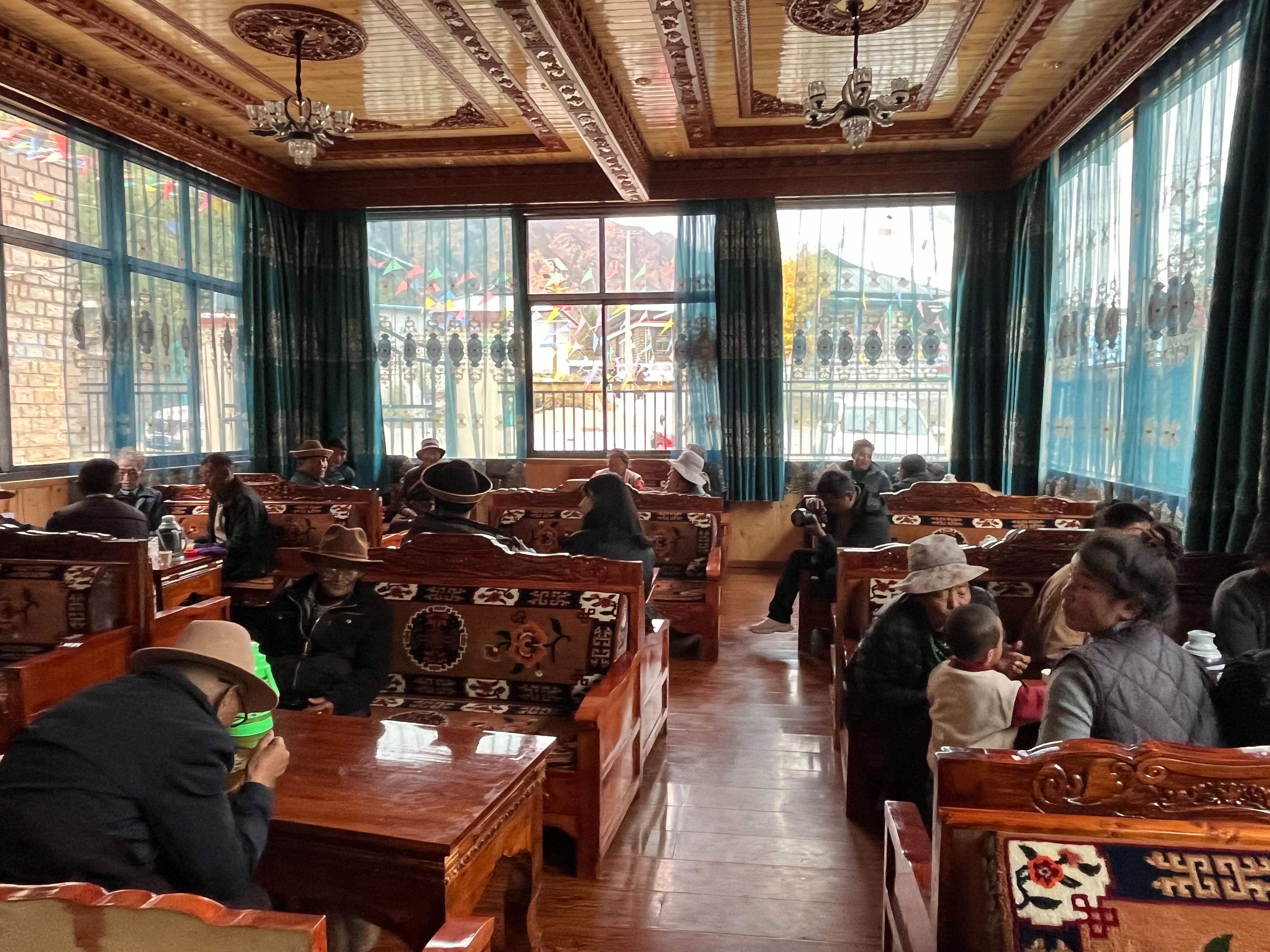 88岁的藏族奶奶益西拉姆是当天茶馆年纪最大的一位老人,她每天中午会从家走来茶馆,约两三百米远,点份餐、一壶茶。这样的生活是年轻时的她完全不能想象的。