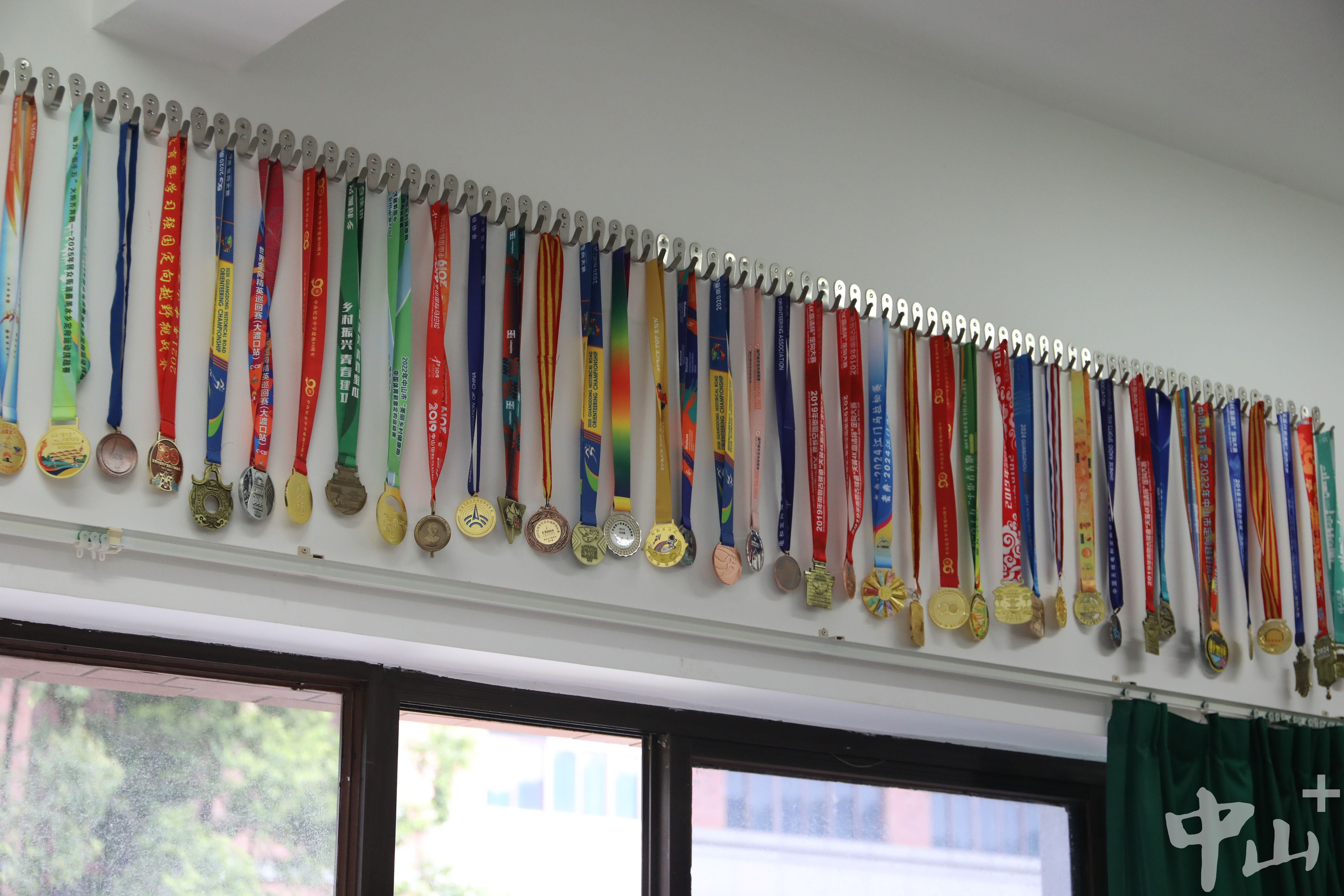 在中山市中山纪念中学的校园里,该校体育老师代为正步履匆匆地穿梭在教学楼之间。她身着一身休闲裙装,与平日里那身熟悉的运动装形成了鲜明对比。走进她的办公室,目光瞬间被满屋的荣誉所吸引——墙上、桌上、柜子里,摆满了定向越野的奖杯和奖牌,每一座都承载着她和学生们无数的汗水与荣耀。