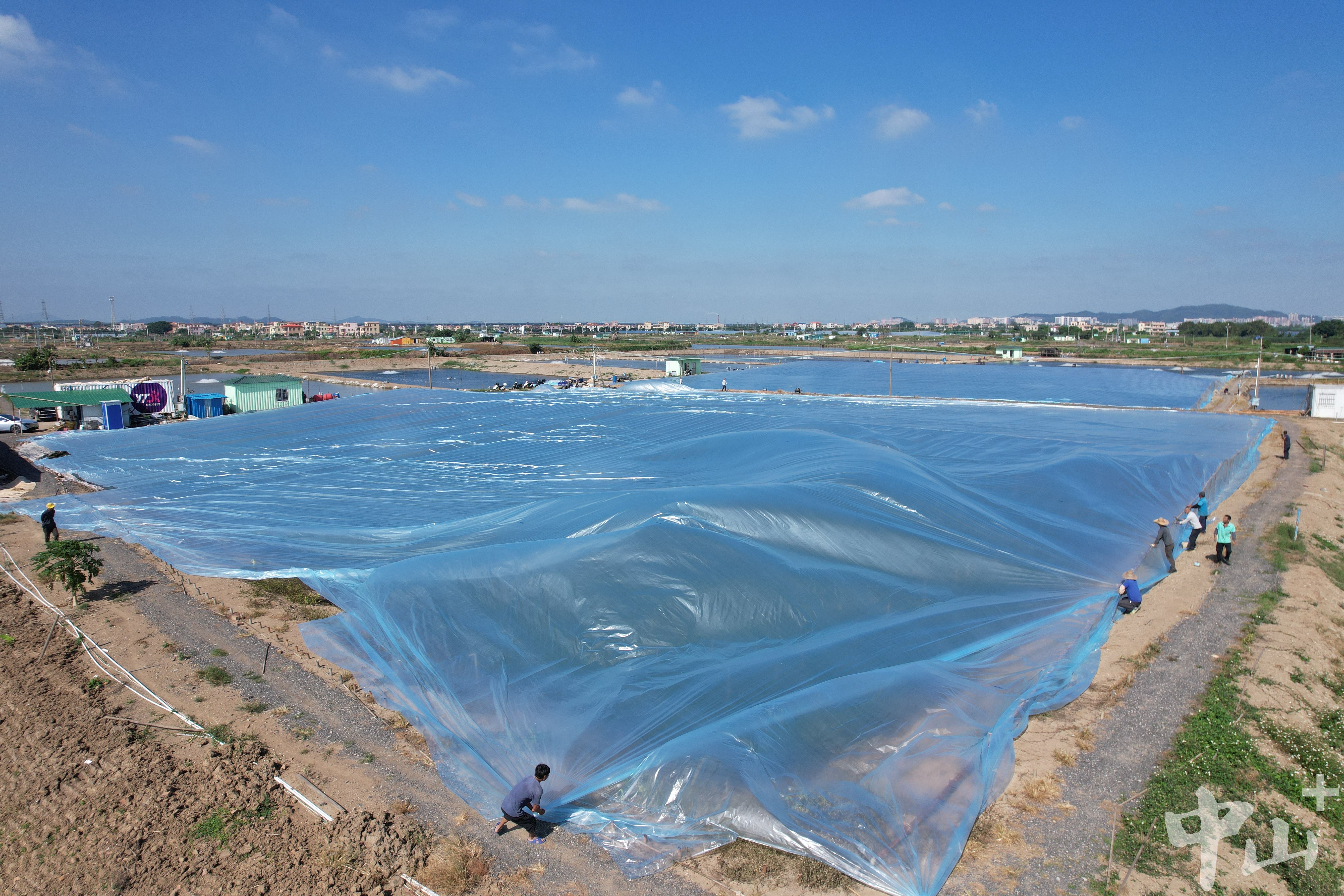 随着气温逐渐走低,中山一年一度的冬棚搭建也进入高峰。11月5日,位于板芙镇的中山市德丰水产养殖有限公司养殖场(以下简称“德丰养殖场”)内一片繁忙,10多名搭棚师傅正有条不紊地将蓝色薄膜固定在木桩支架上,为鱼塘搭建越冬大棚。几个小时之后,这片鱼塘便会被裹上蓝色“暖衣”,为鱼虾撑起抵御低温的“保护伞”。此外,为进一步保障水产安全越冬,中山农业部门也多措并举,全力保障春节水产品供应与农户增收。