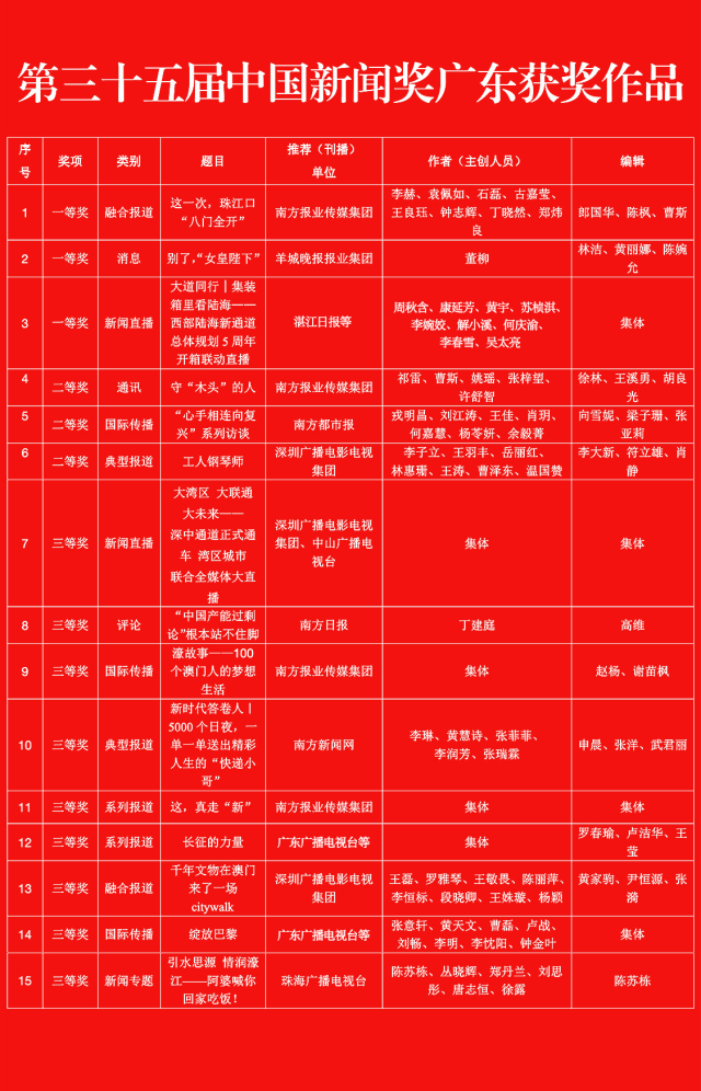 11月5日,第35届中国新闻奖评选揭晓。在落实中央和省委部署奋力推进系统性变革的战鼓声中,广东新闻界迎来大喜讯,全省主流媒体共有15件作品获奖,创历史最好成绩,极大振奋了广大新闻工作者干事创业的精气神。其中南方报业传媒集团《这一次,珠江口“八门全开”》、羊城晚报报业集团《别了,“女皇陛下”》、湛江日报等《大道同行│集装箱里看陆海——西部陆海新通道总体规划5周年开箱联动直播》共3件作品获一等奖,另有3件作品获二等奖、9件作品获三等奖。获奖类别涵盖消息、通讯、评论、系列报道、国际传播、融合报道、典型报道、新闻直播、新闻专题等体裁。