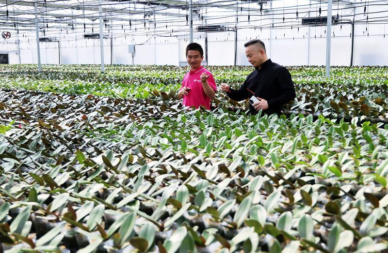 在6000多平米的育种大棚里,另一番忙碌景象彰显着产业底气。“这些种苗按订单定向培育,单只售价8元,这片区域就有300多万元产值。”场长雷学伦指着整齐排列的苗床喜上眉梢。大棚内,温度精准调控在28℃的养苗区与18℃的催花区形成鲜明对比,工作人员介绍,今年6-7月启动催花的兰株,如今正迎来盛花期,这种“工厂化培育+精准控花”技术,彻底打破了蝴蝶兰“只供春节”的局限,实现周年量产。