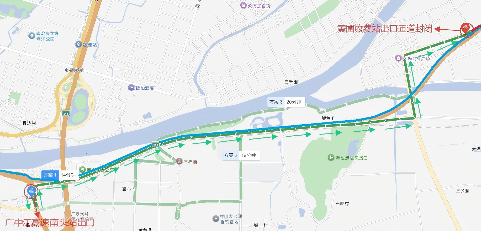 ■当车辆由广中江高速往江门方向行驶时,将车辆引导至南头北收费站下高速,通过地方道路绕行至中山黄圃镇圃灵路。(地方道路引流路线:广中江高速(往江门方向)→南头北收费站出口→岭栏路→大雁路→大雁圃灵路)。