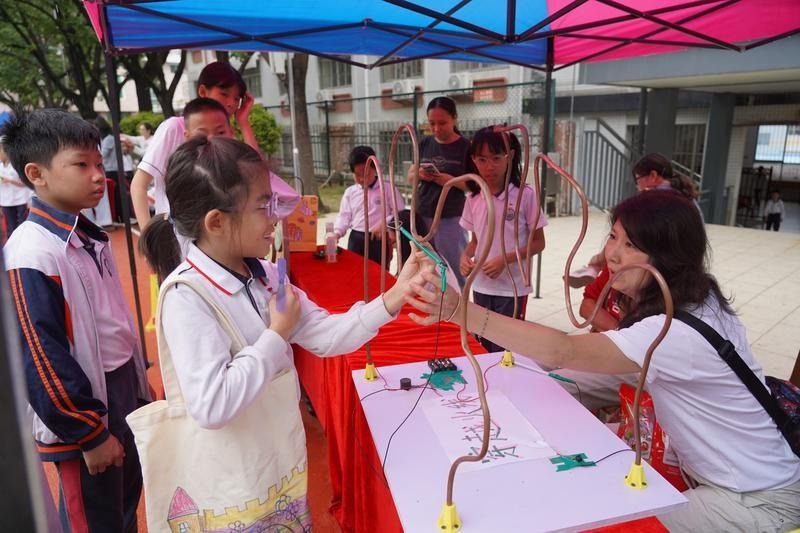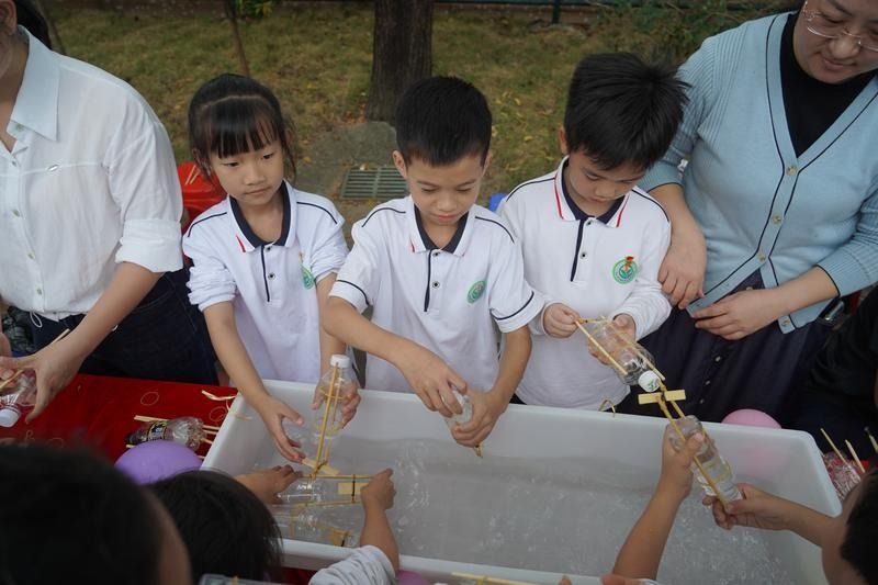 造船厂摊位同样被学生们围得满满当当。孩子们亲手转动皮筋上的木棍,用塑料瓶制作的动力小船便在水中缓缓前行。这些简易小船是二年级(2)班的家长和学生共同完成的成果。“旋转拉伸的橡皮筋储存着弹性势能,松手后势能转化为动力,带着小船一步步向前,这背后有一定的动力原理。”负责的家长介绍,孩子年纪小未必能完成复杂手工,但用身边材料动手创作,同样能收获科学实践的乐趣。