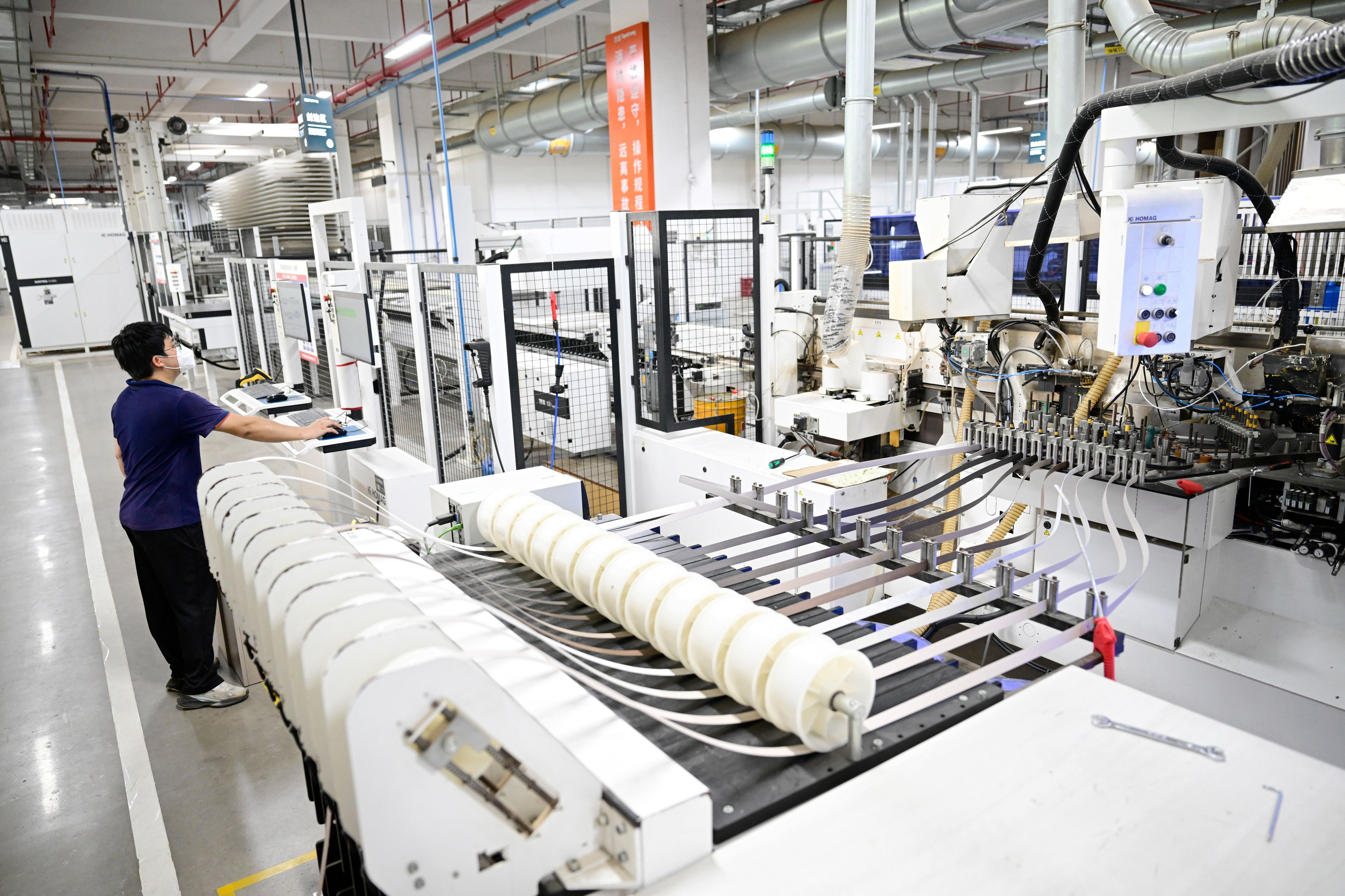 在上市公司广东顶固集创家居股份有限公司(以下简称“顶固集创”)智慧工厂内,机械手高速运转、AGV小车穿梭不停,开料、封边、打包等生产工序全流程自动化推进。顶固集创整家定制经营中心厂长龙华越介绍,得益于中山市出台的一系列成体系的“技改”政策支持,顶固集创加速智能制造布局。“相较于传统产线,智能化产线为企业带来了实实在在的效益。”龙华越举例,若按相同订单数量计算,传统产线需要160多名工人耗时3天才能完成,而智能化产线仅需15个人花费6小时便能完成全流程生产。厂区超万平方米生产区域,仅需15名工人即可实现全流程生产。