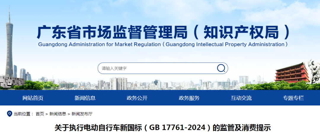 11月14日,广东省市场监督管理局发布“关于执行电动自行车新国标(GB 17761-2024)的监管及消费提示”。