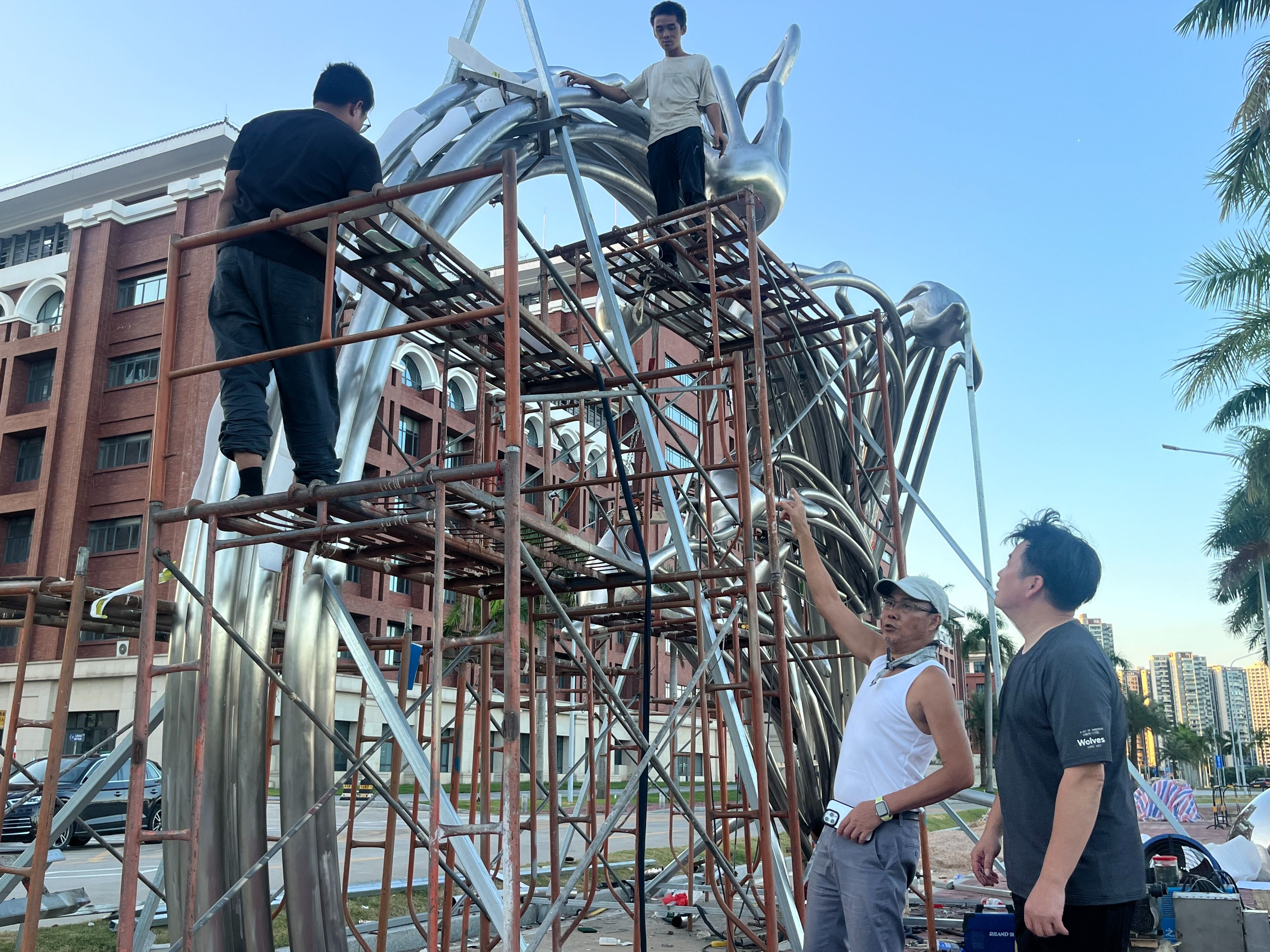 创作的起点,是一场“向自然取经”的修行。为捕捉白海豚最鲜活的跃动姿态,裘科斌带着团队多次乘船驶入珠江口,在颠簸的渔船上架起相机,记录下百余组海豚出水的瞬间。“它们跃出水面时,鳍尖带着风的阻力,尾鳍裹着水的张力,每一个弧度都藏着生命的力量。”回到工作室,这些影像成为最珍贵的参考,而他心中的另一份执念,是让冰冷的金属染上岭南的温度。