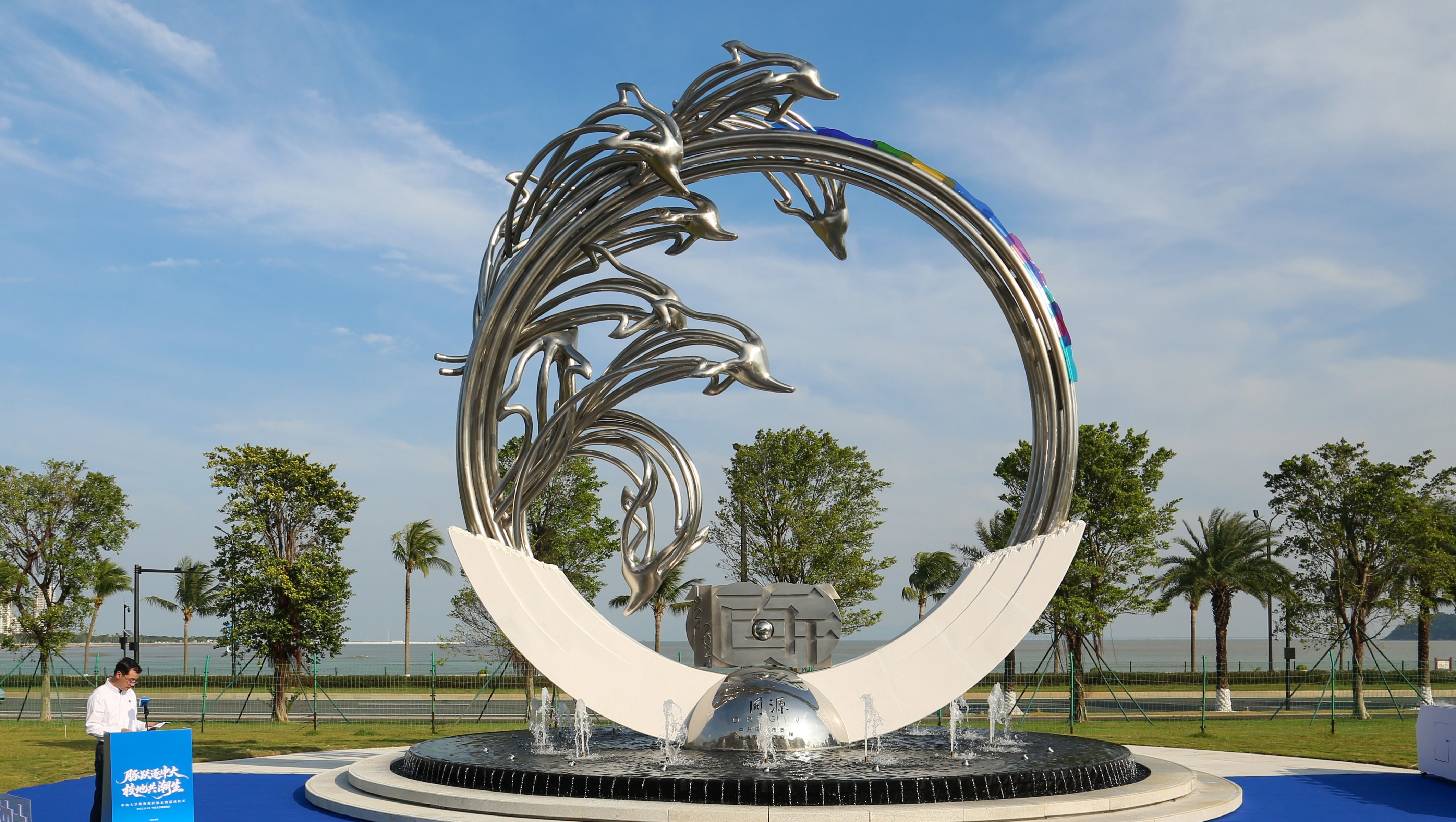 11月中旬,中山大学珠海校区内,一座银白雕塑在日光下流转着温润光泽:9只中华白海豚首尾相衔、跃动成环,金属流线交织间,仿佛能听见浪涛与时光的共鸣。这便是中山大学百年校庆标志性作品《同源·中华白海豚》,由国际著名设计师韩秉华操刀设计,中山籍雕塑家裘科斌历时一年落地实施。