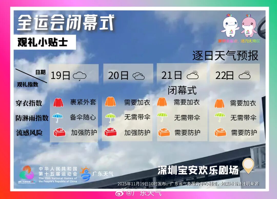全运会闭幕式天气:全运会闭幕式将于2025年11月21日,在深圳市宝安区欢乐港湾西侧的欢乐剧场举行。深圳欢乐港湾21日,冷空气影响减弱,多云到晴天,气温15到22℃,最大阵风地面4到5级,50米高空6级左右;重点时段(17-22时),多云到晴天,气温17到20℃,地面最大阵风4到5级,50米高空最大阵风6级左右。气象风险较低,不过早晚体感清凉,需注意保暖。