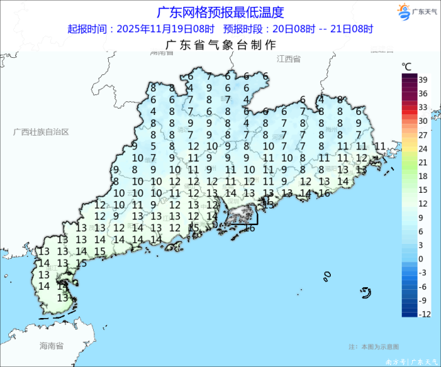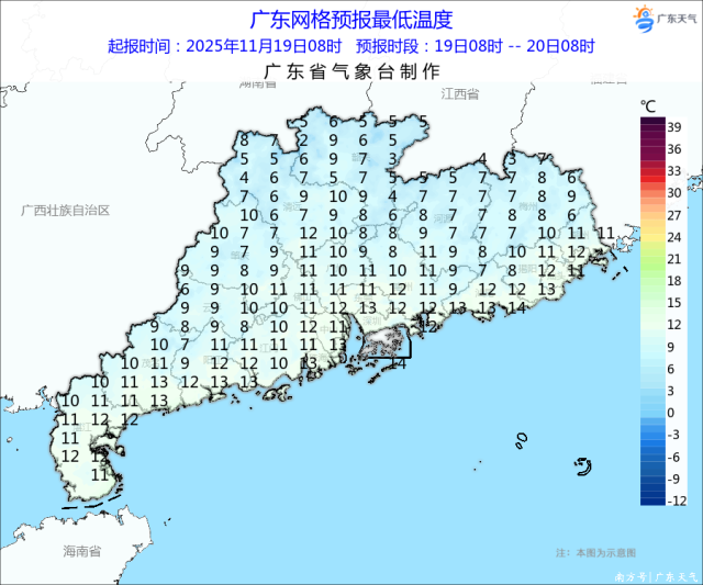 今天(11月19日)早晨,广东大部气温创下半年新低,最低气温:粤北偏北市县6~8℃,其余市县9~12℃,广州10.5℃,深圳11.6℃。(注:统计站点为国家基本气象站)