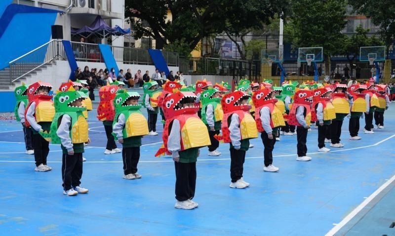 如果说社团表演是“团体技”,那么各年级的入场方阵就是一场个性张扬的“时装秀”。低年级的“小豆包”们手持彩色花球,有的还扮成萌趣小恐龙,童真烂漫,萌力值爆表;中年级的孩子们步伐矫健,挥舞着鲜艳的小彩旗,朝气蓬勃;二年级11班的“重量级嘉宾”——极具东区本土特色的非遗龙头道具,一出场便赢得满堂彩,尽显昂扬与担当。