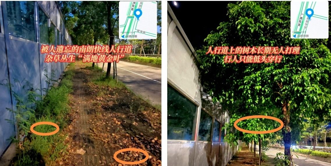 “中山+”用户:南朗快线海湾城路段人行道长期处于管理缺位状态,杂草丛生,落叶堆积无人清理;树木生长杂乱无章,树枝横生致行人需低头穿行;路面水泥疙瘩凸起,频繁绊脚存安全隐患。希望相关部门加强辖区环境卫生与设施管理,妥善解决该路段人行道问题。