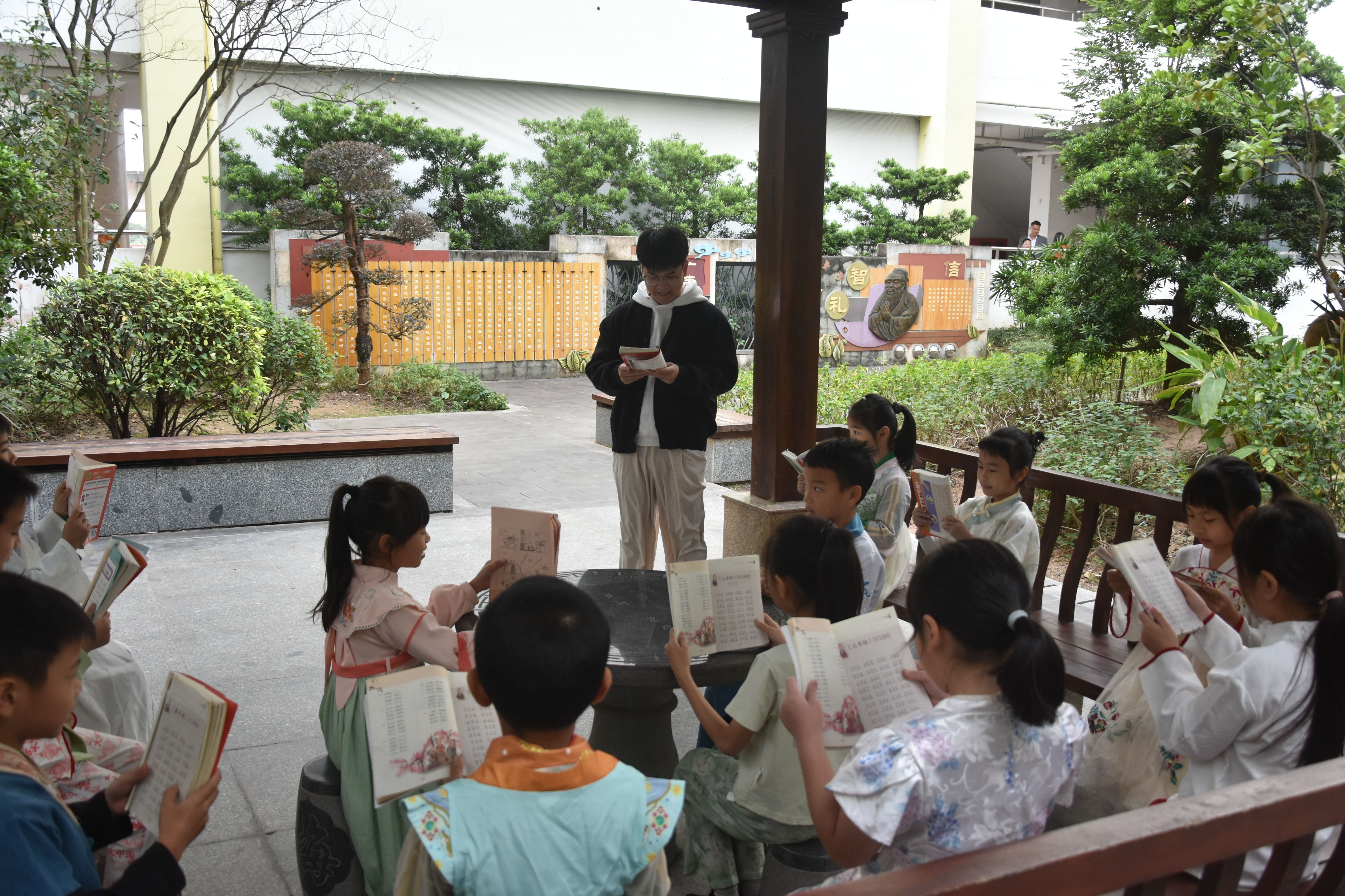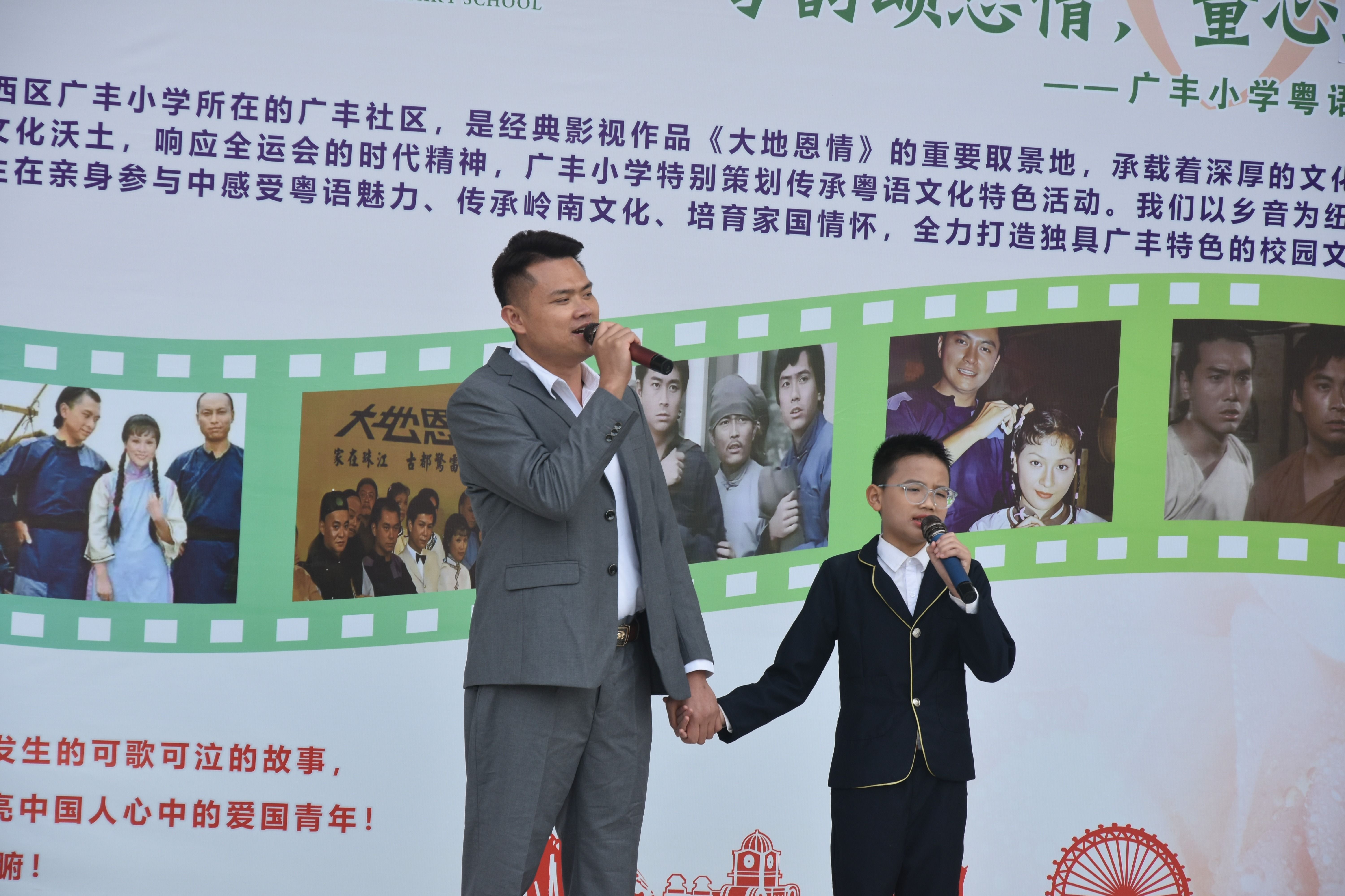 作为经典影视作品《大地恩情》的取景地,西区广丰小学将本土历史底蕴与粤语文化传承深度融合,在活动中集中展现了粤语进校园的丰硕成果。亲子联唱环节,家长代表赖海鹏与孩子携手演绎《大地恩情》主题曲,熟悉的乡音传递着浓浓的乡情,赢得现场阵阵掌声;校园古亭内,老师带领身着汉服的小朋友用粤语吟诵《三字经》,字正腔圆的韵律中满是传统韵味;红星舞台上,10名学生吟唱经典粤语童谣《月光光》,稚嫩的歌声引得现场观众不自觉跟着哼唱。