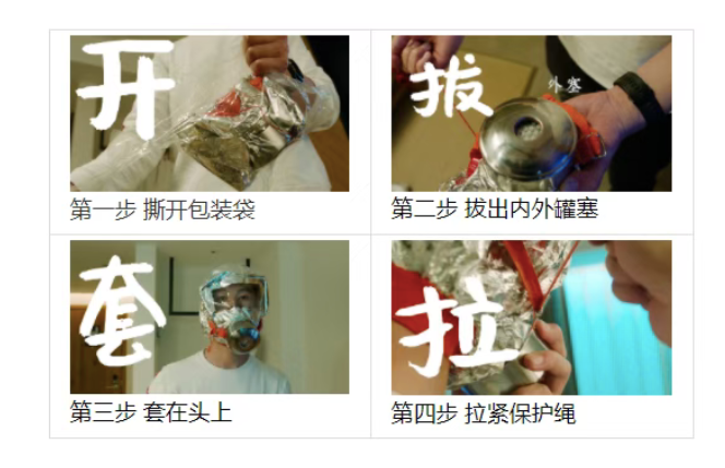 套:套在头上,用手握住罐体,将呼吸口对准口鼻处,鼻身两侧不留空隙,视窗向前。