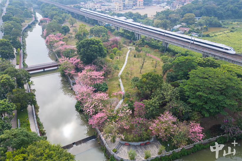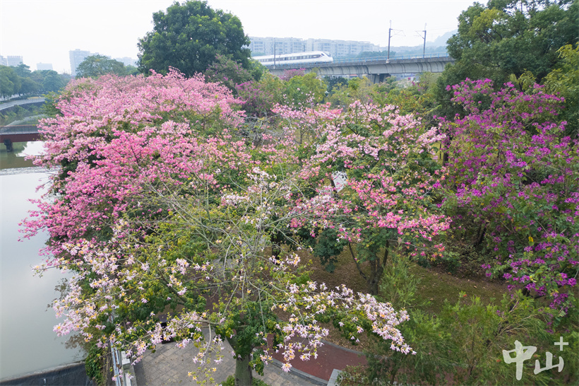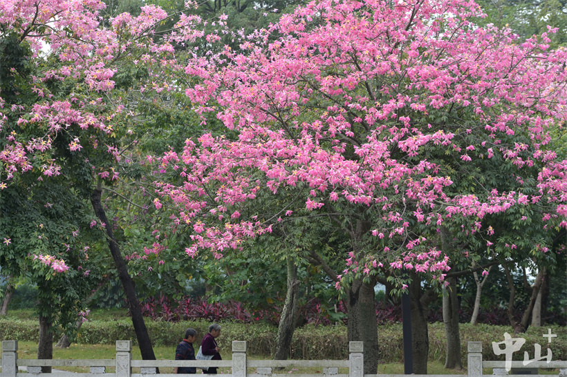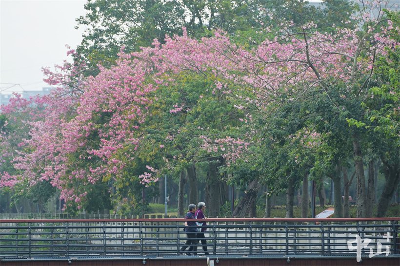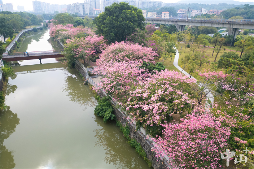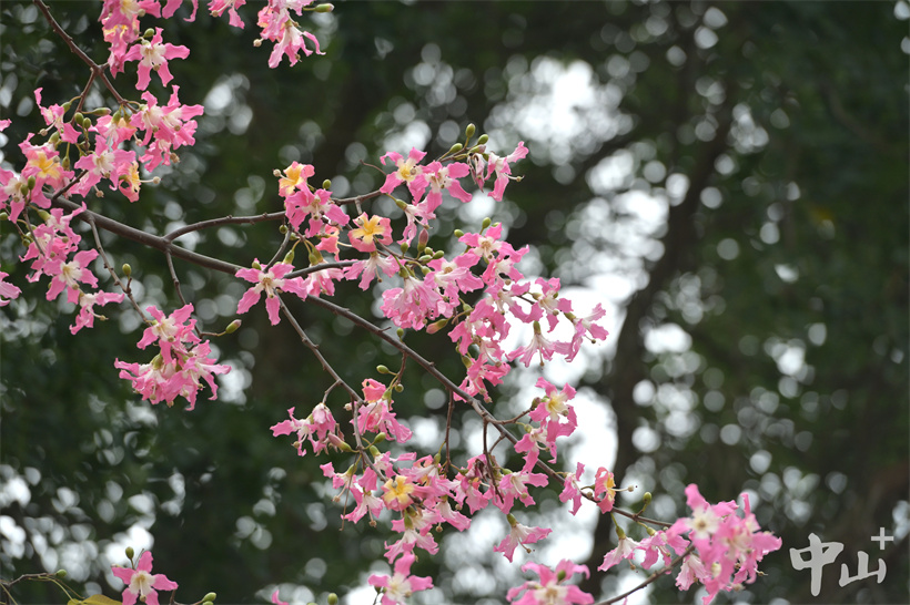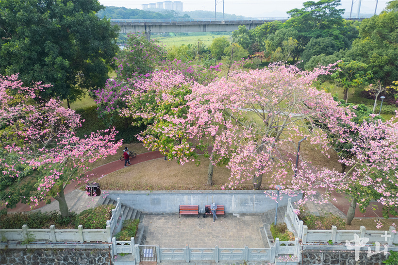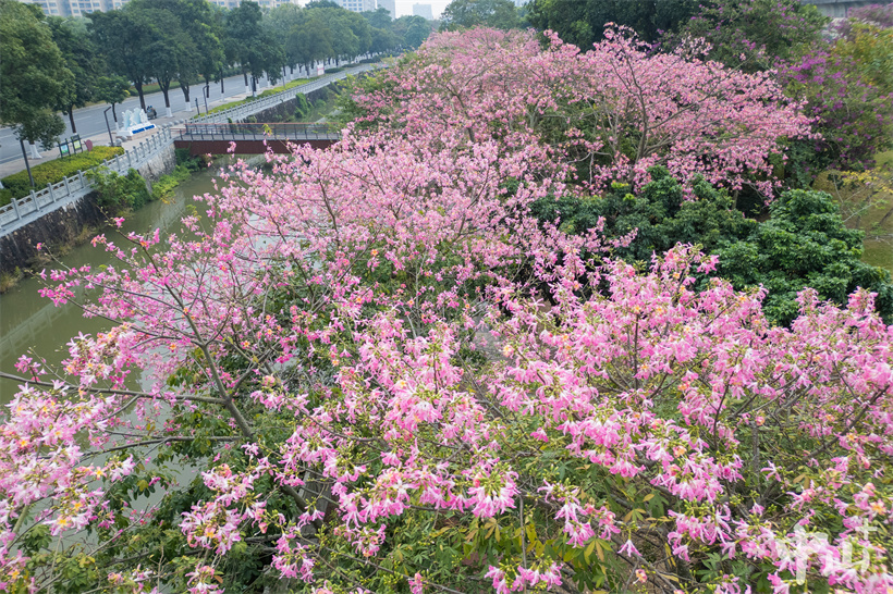 近日,南朗街道大溪涌边的美丽异木棉盛开,一棵棵粉红色的花树将大溪公园装扮得格外美丽。