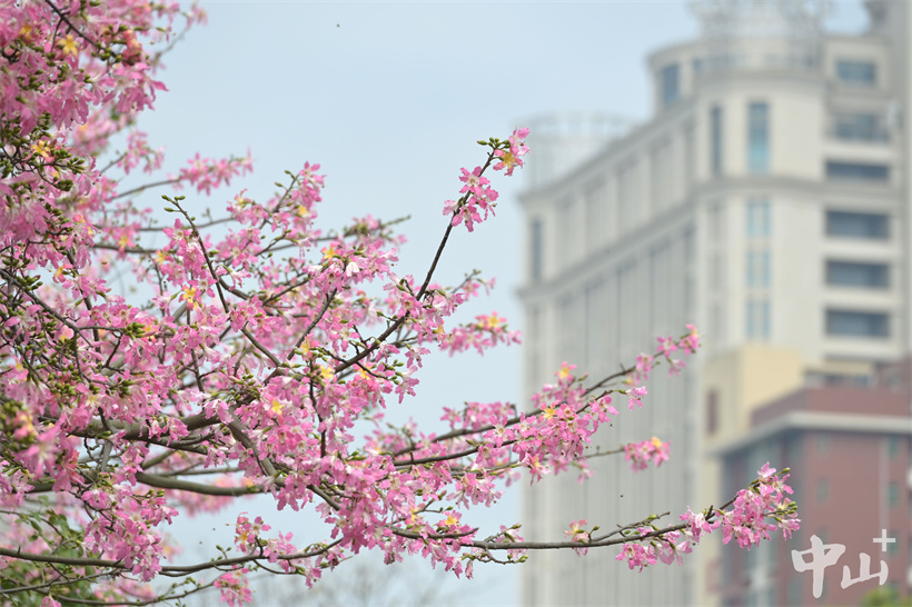 ▲美丽异木棉与楼宇相映成趣。