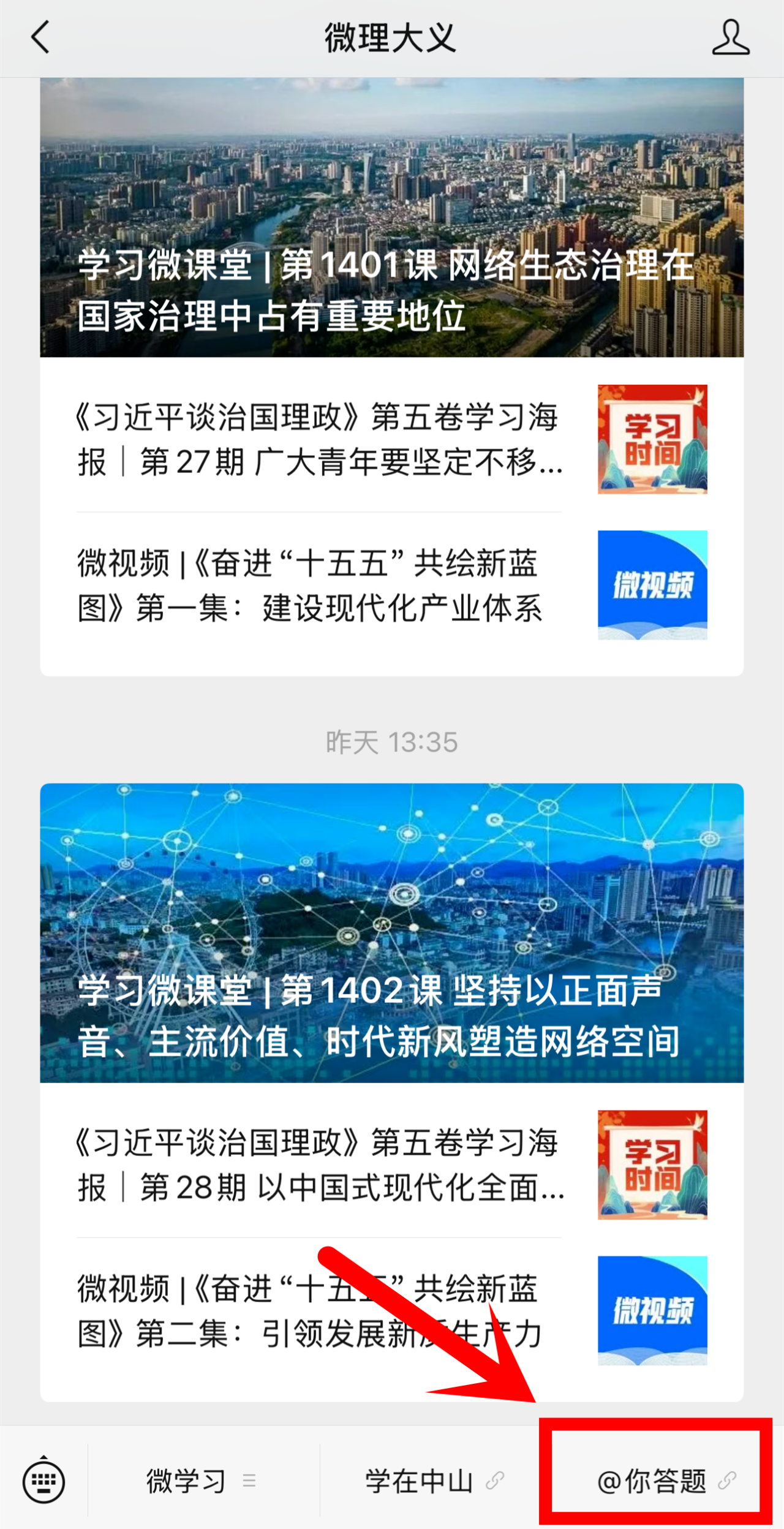 2.打开“微理大义”微信公众号,点击底部菜单栏“@你答题”参与答题。
