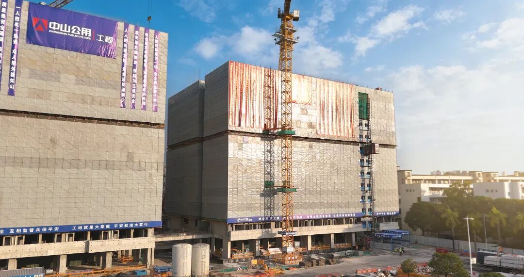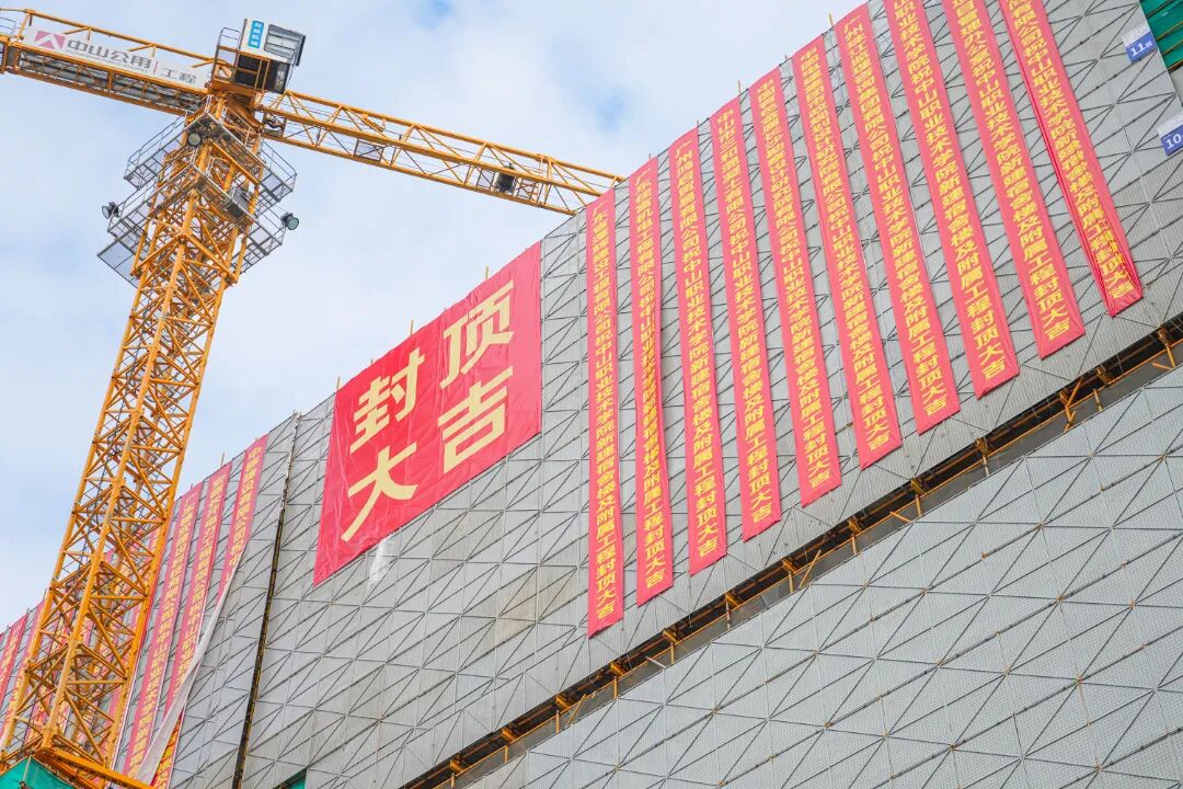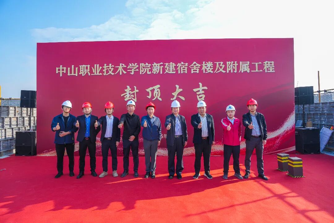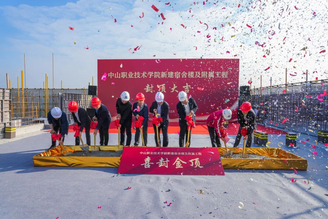 项目现场举行了简朴而隆重的封顶仪式。中山职业技术学院、中山市代建项目管理办公室、中山公用工程有限公司等项目参建方领导及代表共同见证了这一重要时刻。