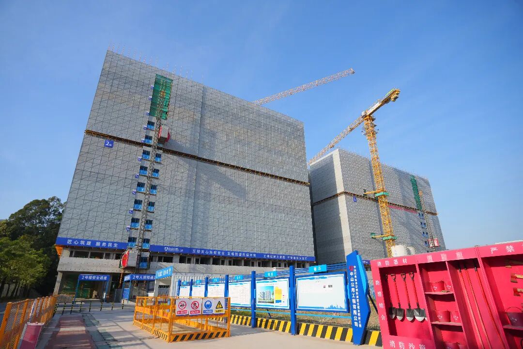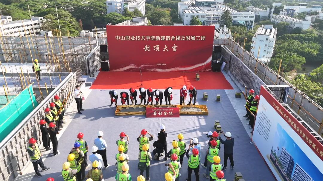 12月12日上午,随着最后一方混凝土浇筑完成,中山职业技术学院新建宿舍楼及附属工程主体结构正式封顶。两栋崭新宿舍楼在晨光中巍然矗立,标志着学校基础设施建设取得关键进展。