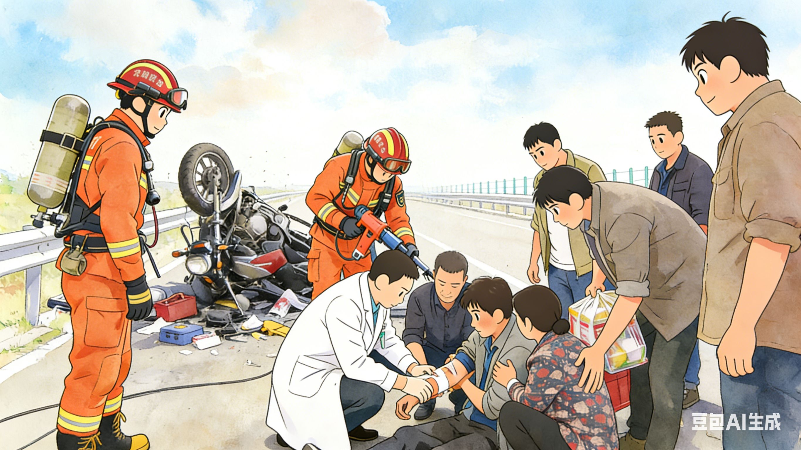 我的处理:在事故后方约10米处停放一辆本人摩托车,后加停1辆电动车,设置警戒,防止二次伤害;我快速表明身份,取得路人信任及有心人支援,同时做了这些事情: