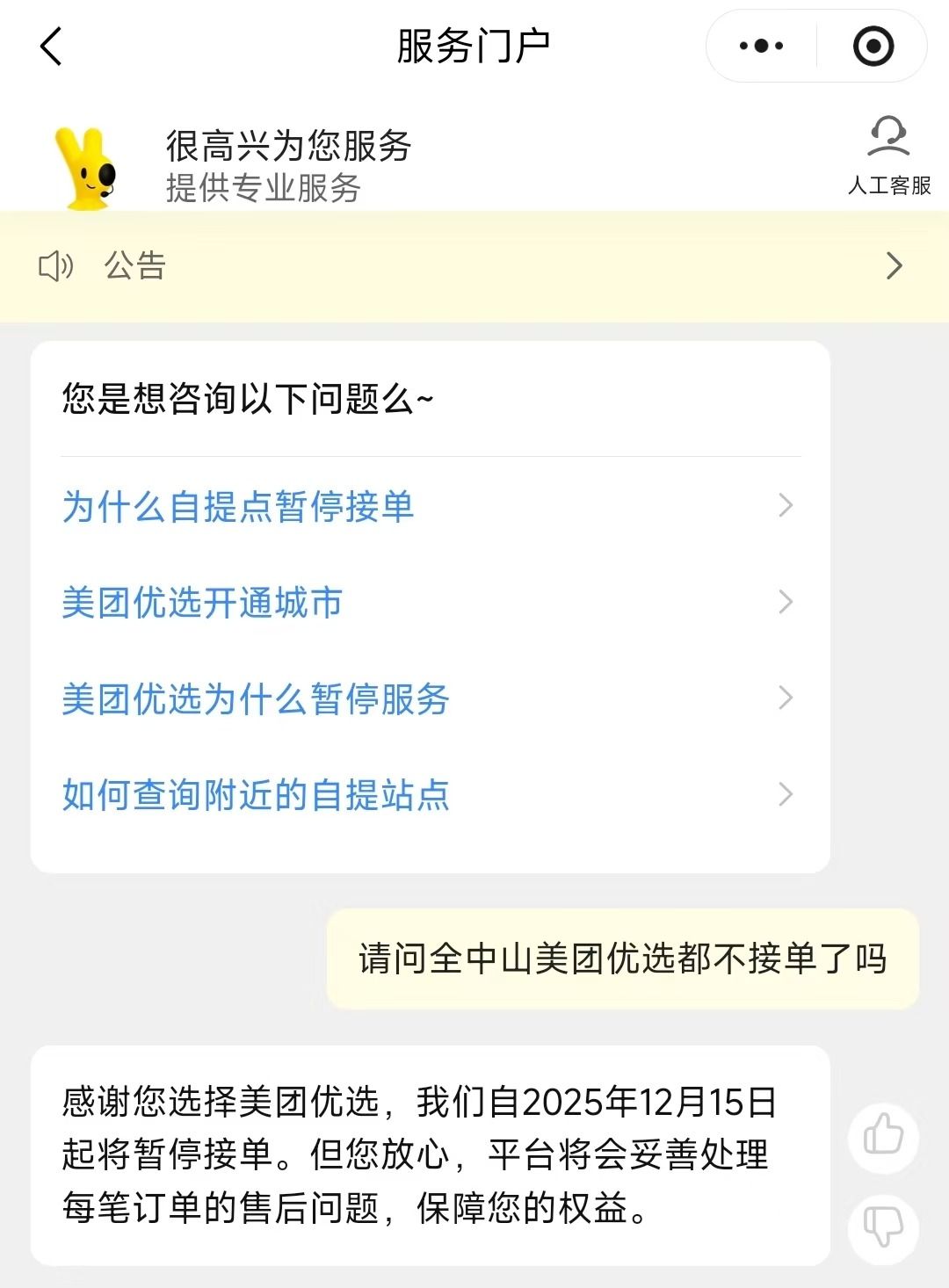 12月16日傍晚,小编询问美团客服关于美团优选的消息,客户表示:“我们自2025年12月15日起将暂停接单”。