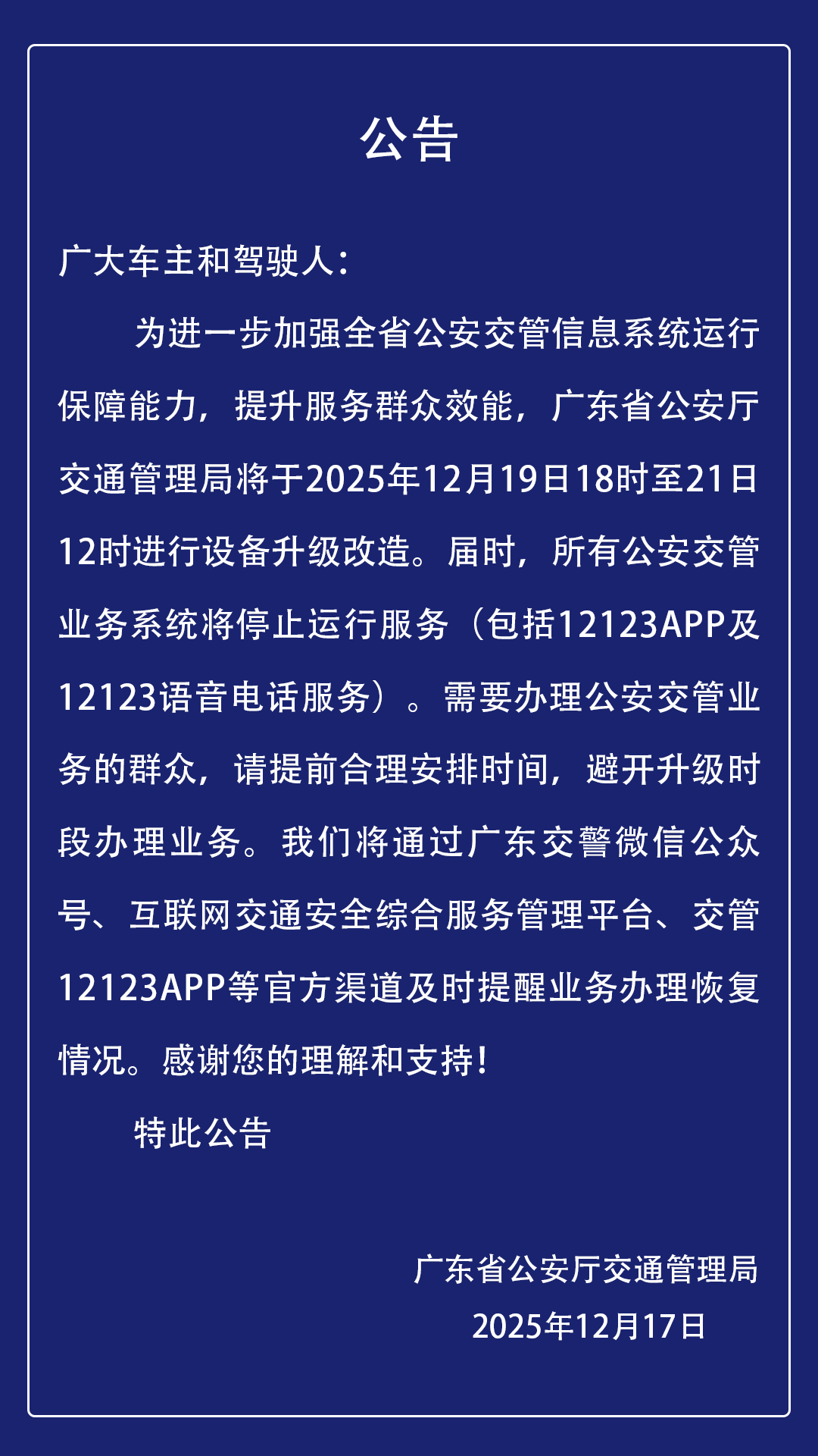注意!这个时间段,广东公安交管业务系统将停止运行服务