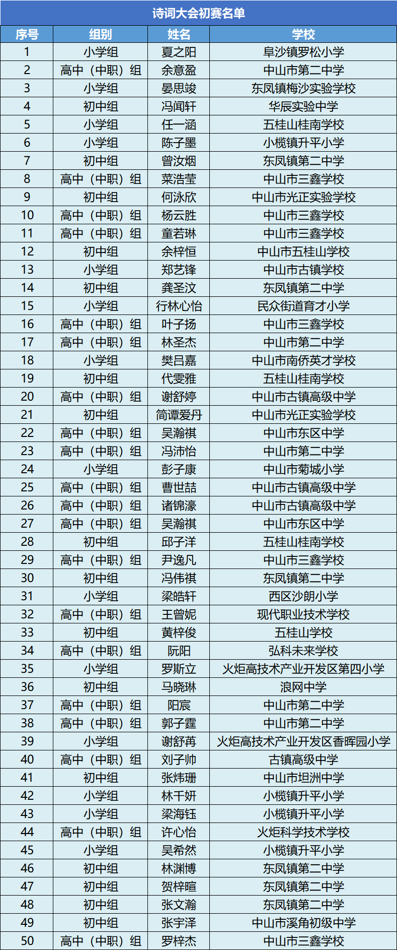 12月17日,记者从中山市教育和体育局获悉,2025-2026学年中山市“香山杯”诗词大会初赛已于12月14日落幕,全市2000余名中小学生以诗会友,以词传情,经过激烈角逐,最终105名选手(含6名并列第100名的选手)凭借深厚的诗词积累与出色表现,成功晋级线下决赛。