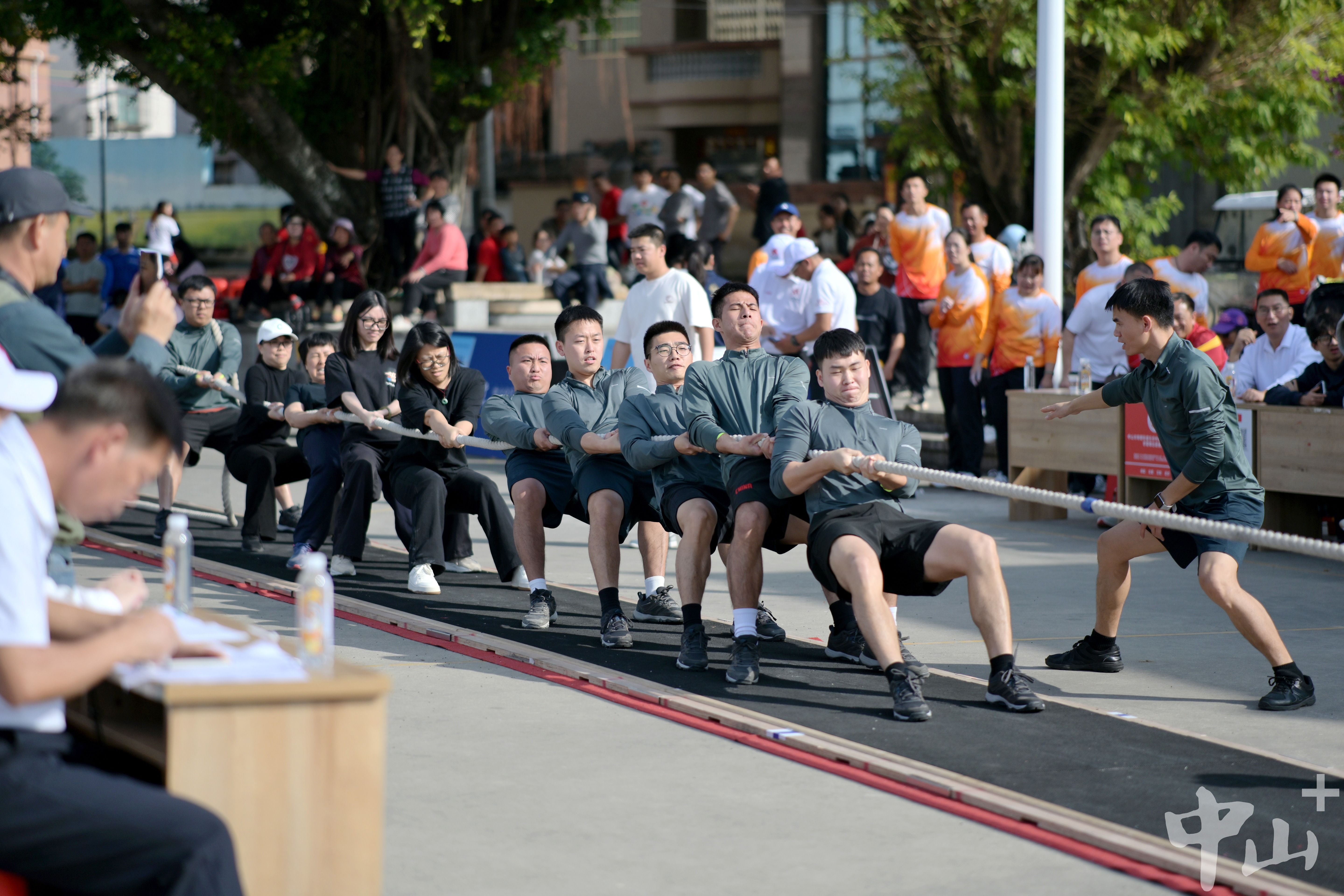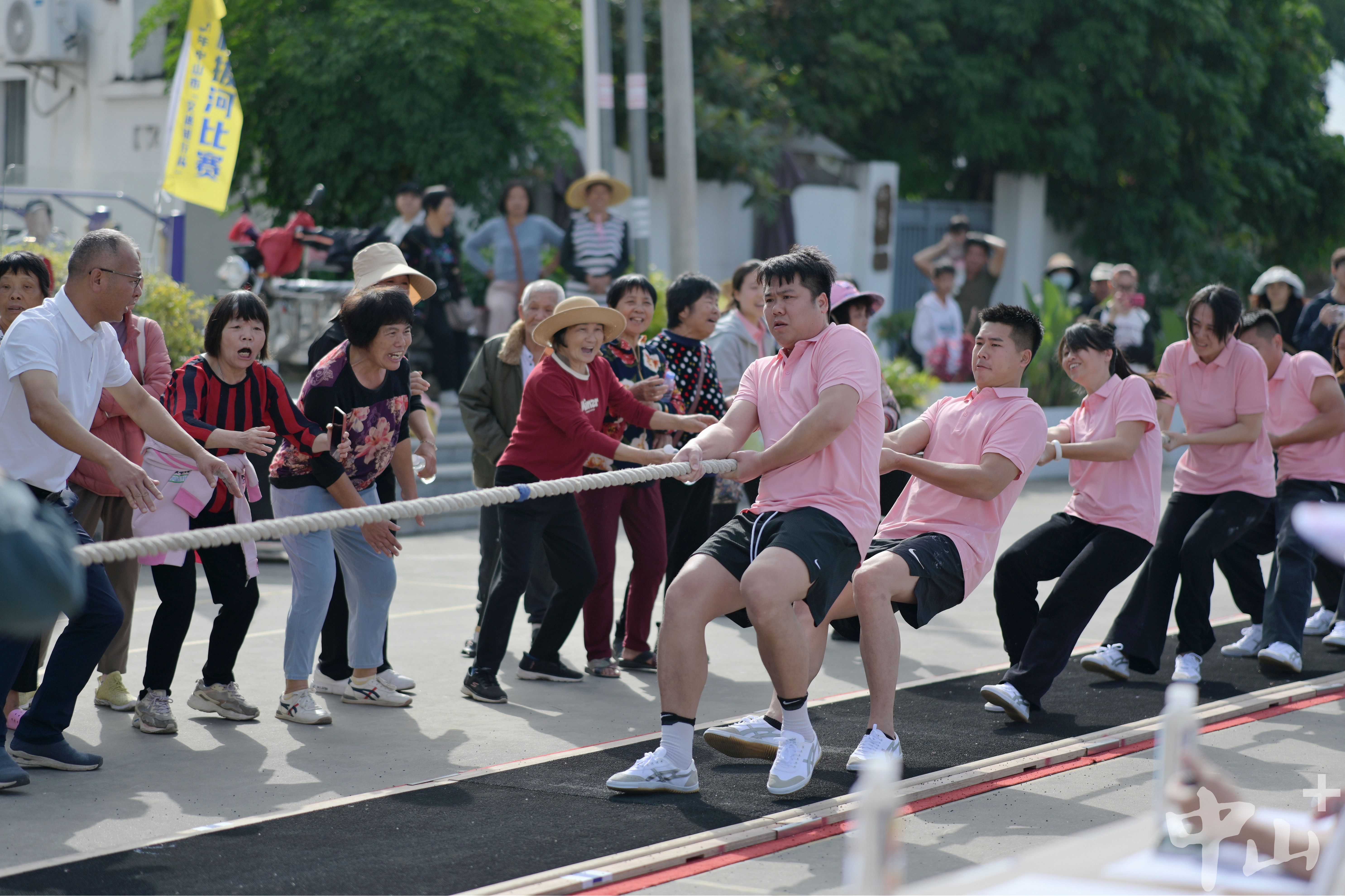 上午九点,左步村欧家广场已人头攒动、气氛热烈。来自翠亨新区(含南朗街道)、火炬开发区(含民众街道)和五桂山街道的10支拔河队伍精神抖擞、斗志昂扬,在广场上整装待发等候比赛。随着动感的音乐声响起,比赛正式拉开帷幕。只见上场队员双手紧握粗麻绳,身体后倾,全力向后拉拽。顷刻间,所有围观村民、游客和孩童的目光,齐刷刷聚焦于绳中央那一点鲜红的标记。紧接着广场上的声浪随之涌起——呐喊声、助威声、欢笑声如潮水般层层迭起,持续不断,却始终洋溢着明快而温暖的氛围。