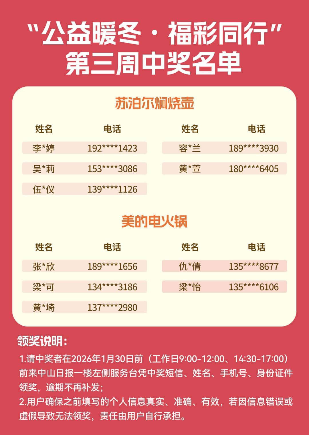 3.中奖结果将在本条推文内公布,并以短信方式通知中奖用户。请中奖者在2026年1月30日前(工作日9:00-12:00、14:30-17:00)前来中山日报一楼服务台凭中奖短信、姓名、手机号、身份证件领奖,逾期不再补发。