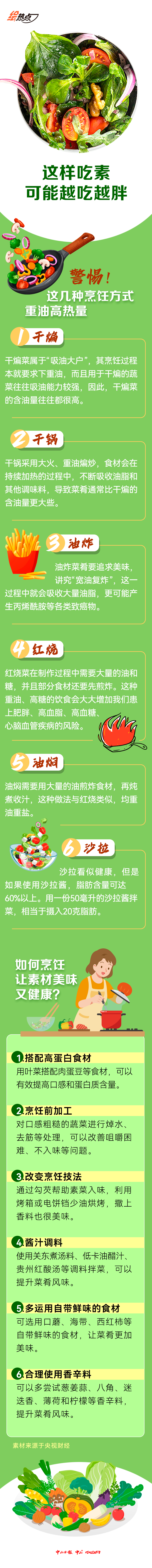 吃素为啥不一定能减重?实际上,缺乏运动,饮食中糖、油脂等高热量的食物占比过多,都容易使我们能量超标,但更容易被忽视的是烹饪方法。