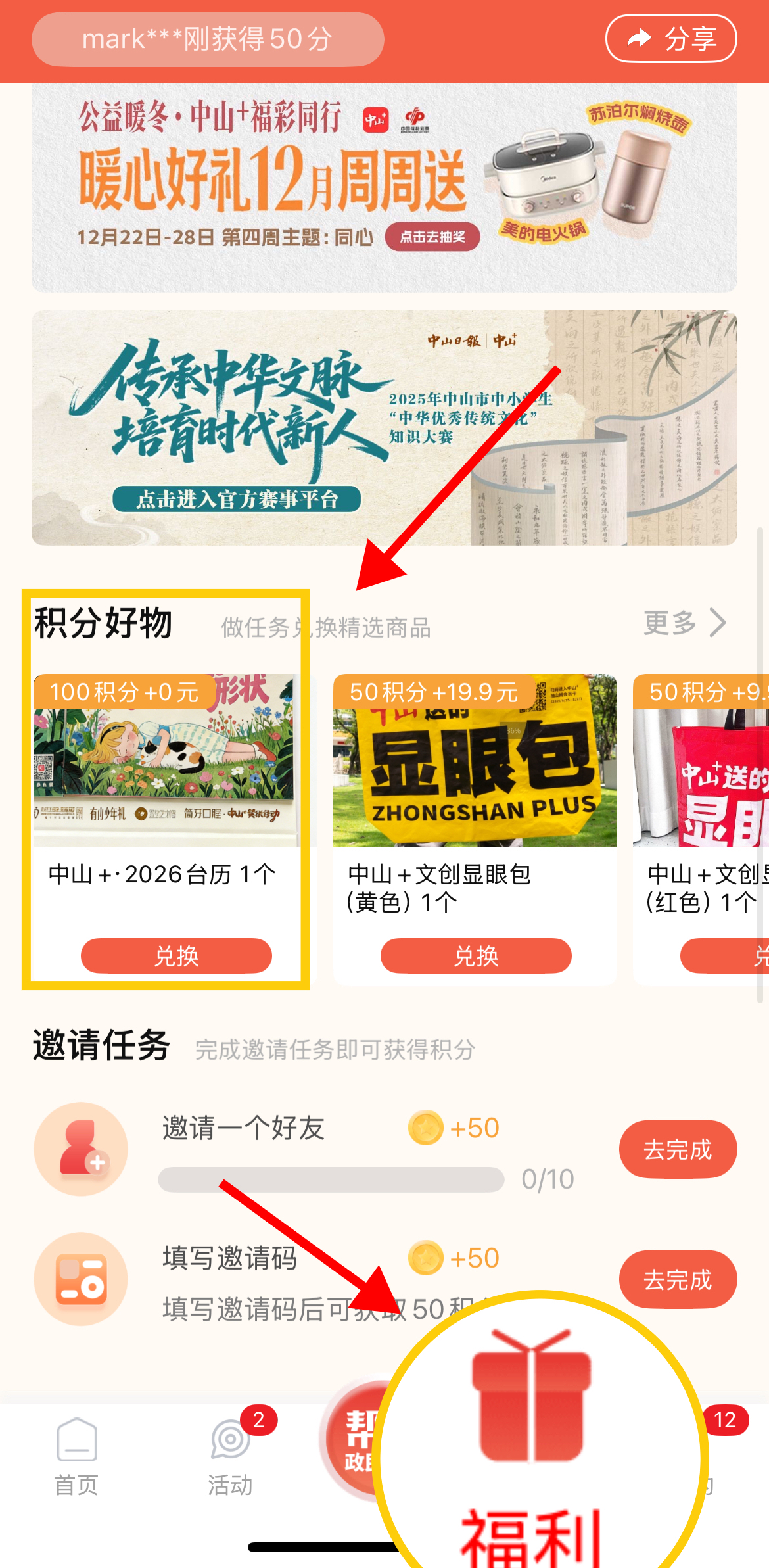2.点击右下角“福利”按钮,并按照提示使用微信一键登录。进入【福利】版块下滑找到【积分好物】,即可用100积分直接0元兑换,库存有限,先到先得!