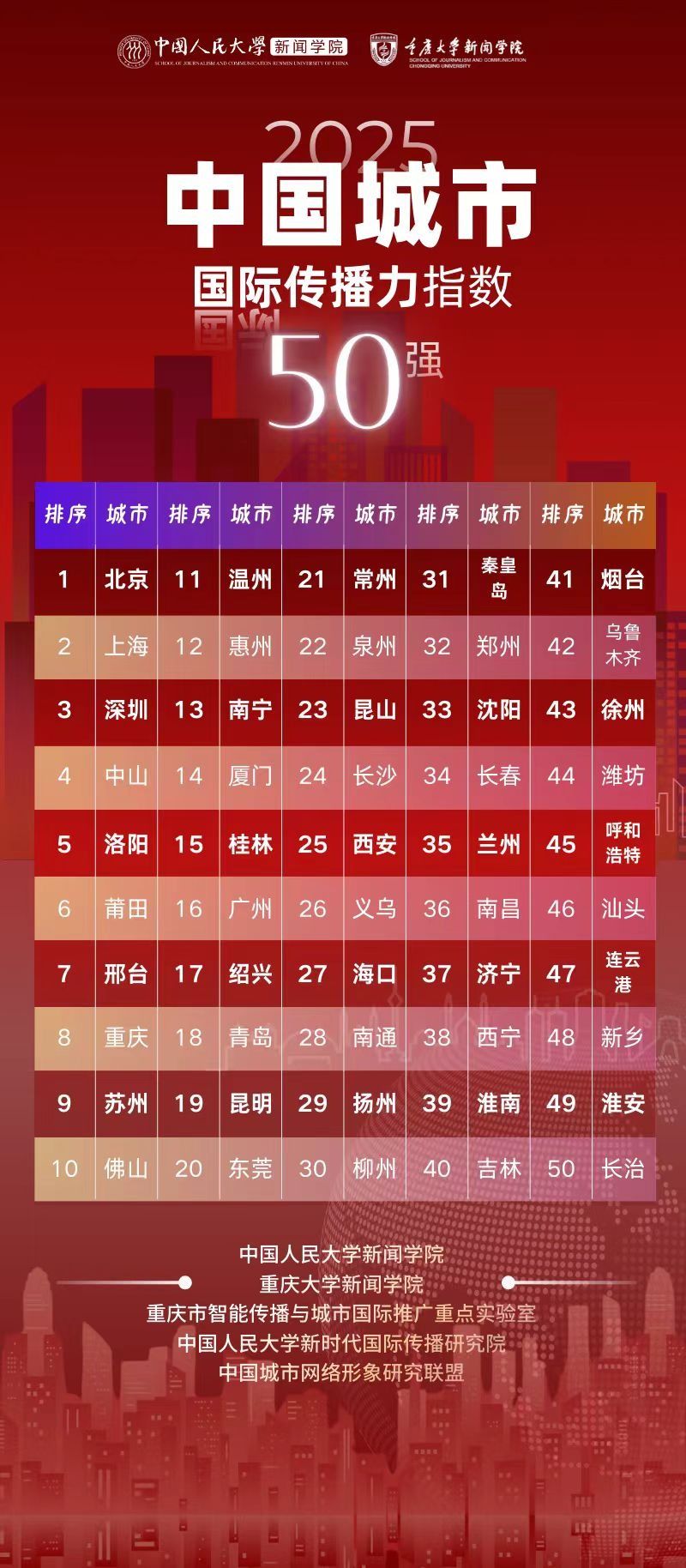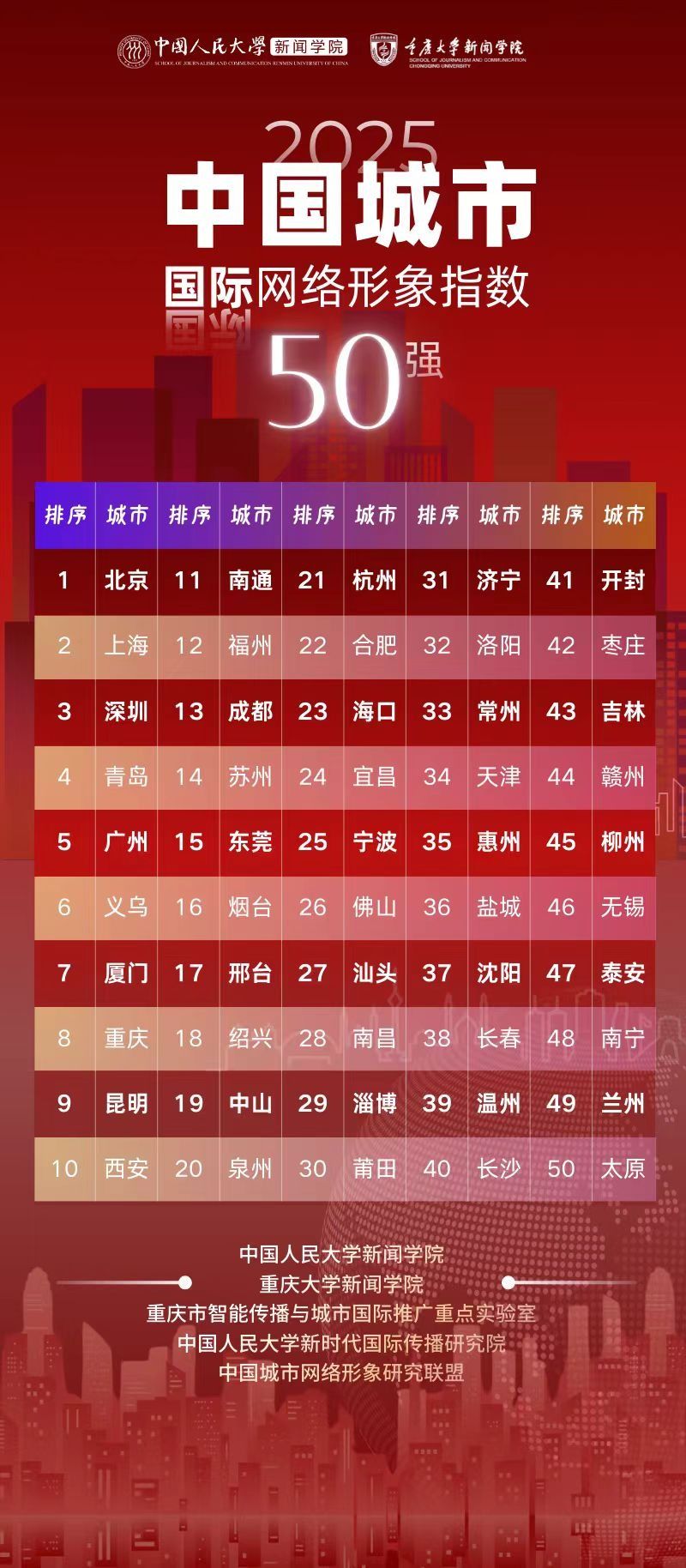 12月28日,第二届中国城市网络形象创新发展论坛暨《中国城市国际网络形象指数报告(2025)》发布会在重庆举行。本次论坛由中国人民大学新闻学院、重庆大学新闻学院主办,现场发布了《中国城市国际网络形象指数报告(2025)》(以下简称“报告”)。该报告以全国106座大城市为分析对象,围绕国际传播力、网络形象、国际影响力、国际认同力等维度,对城市的国际形象展开分析。